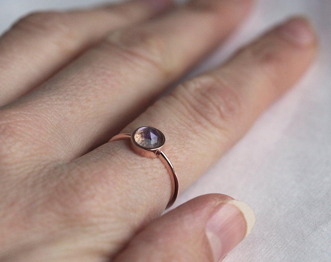 Prsten sa okruglim rose cut rainbow mesečevim kamenom u bezel setting-u