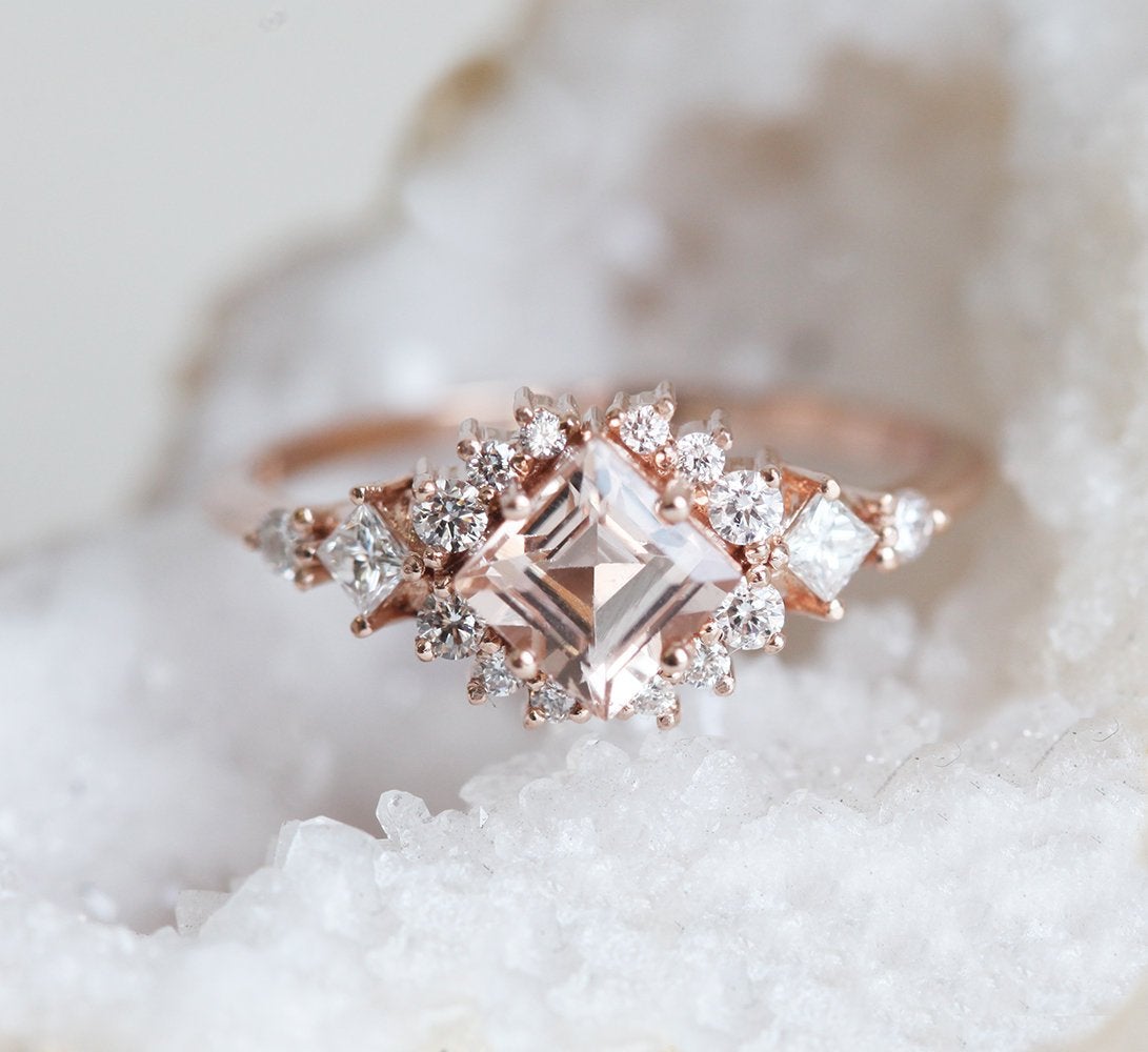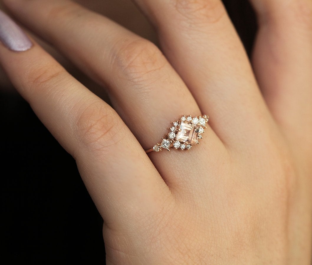 Chiara klaster prsten sa breskvasto roze morganitom i belim dijamantima. Luksuzan i romantičan izbor za verenički prsten koji naglašava eleganciju i nežnost.