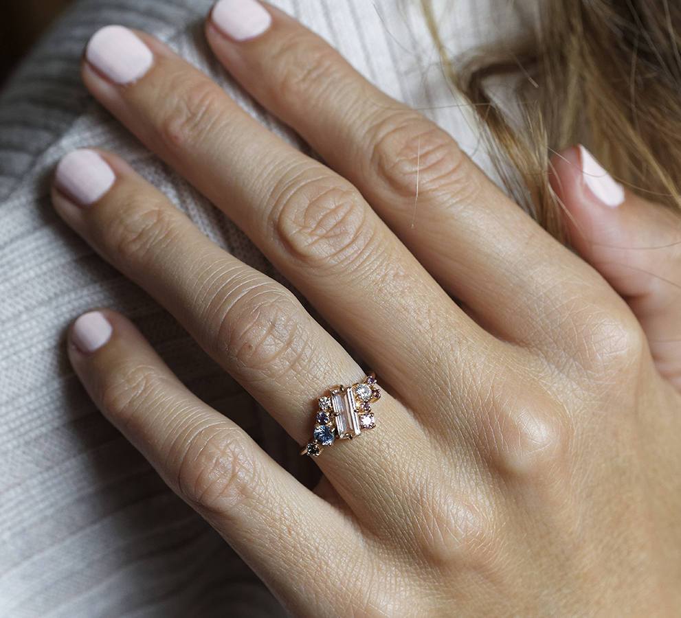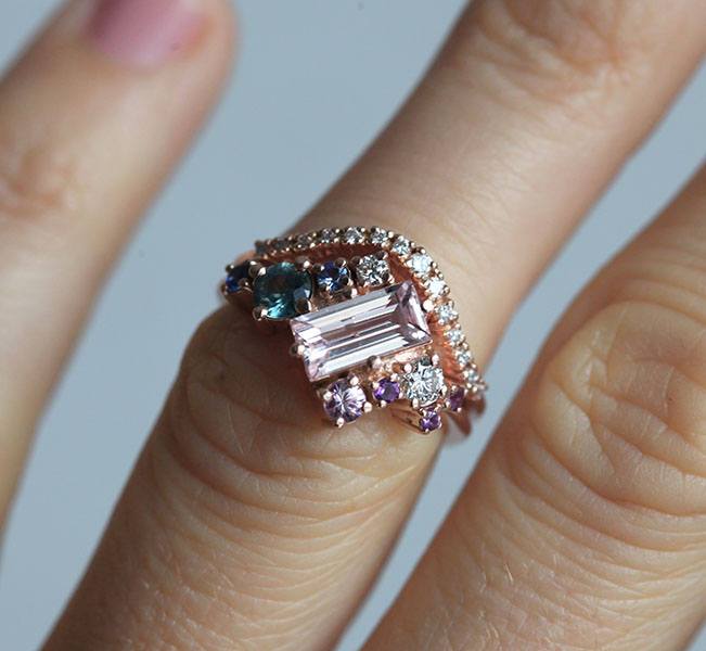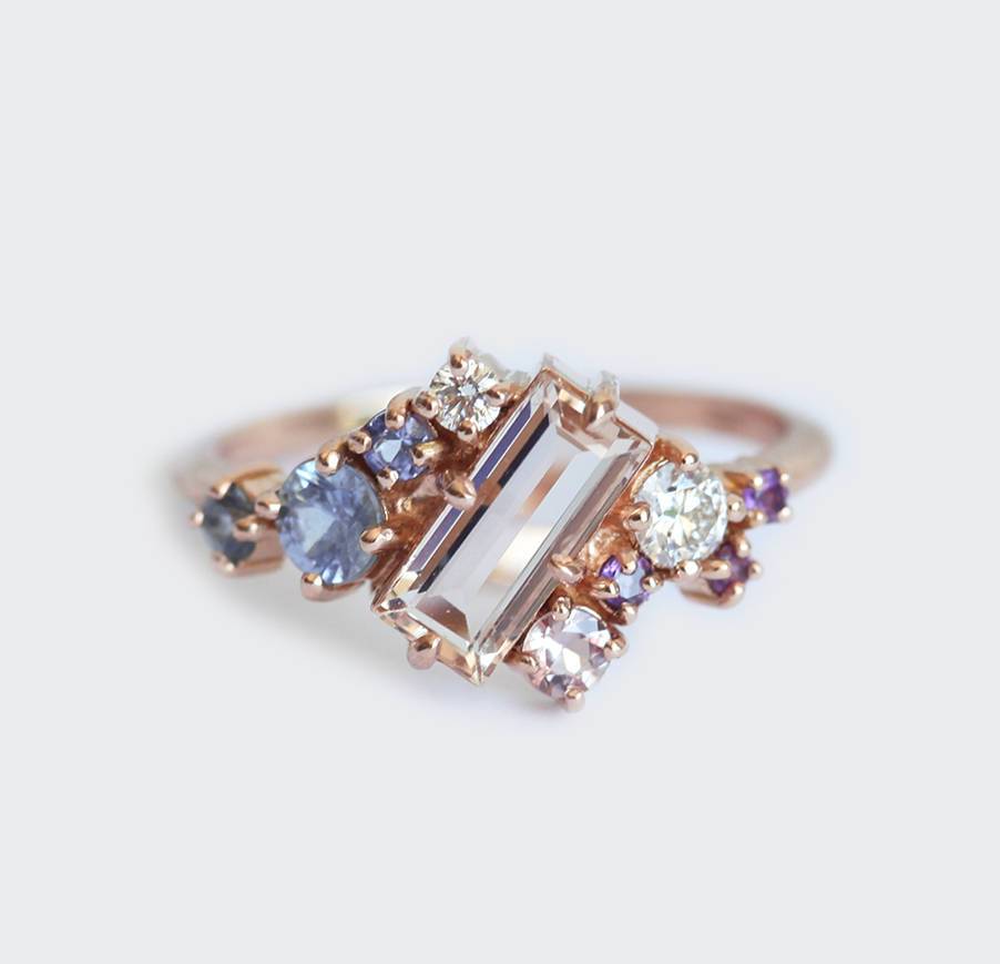 Lila, naš verenički prsten sa morganitom, prirodnim dragim kamenom u boji breskve u baguette rezu, sa bočnim plavim i roze safirima, belim dijamantima i ljubičastim ametistima. Zapanjujući moderni višekamenasti klaster prsten sa šarenim dragim kamenjem.