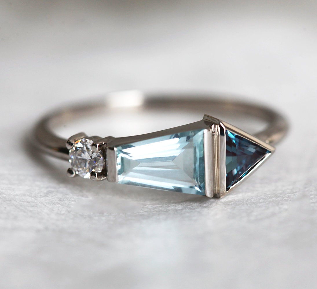 Moss agate verenički prsten sa trapezoidno sečenim kamenom, trouglastim zelenim turmalinom i okruglim belim dijamantom. Moderan jedinstveni prsten sa tri kamena.