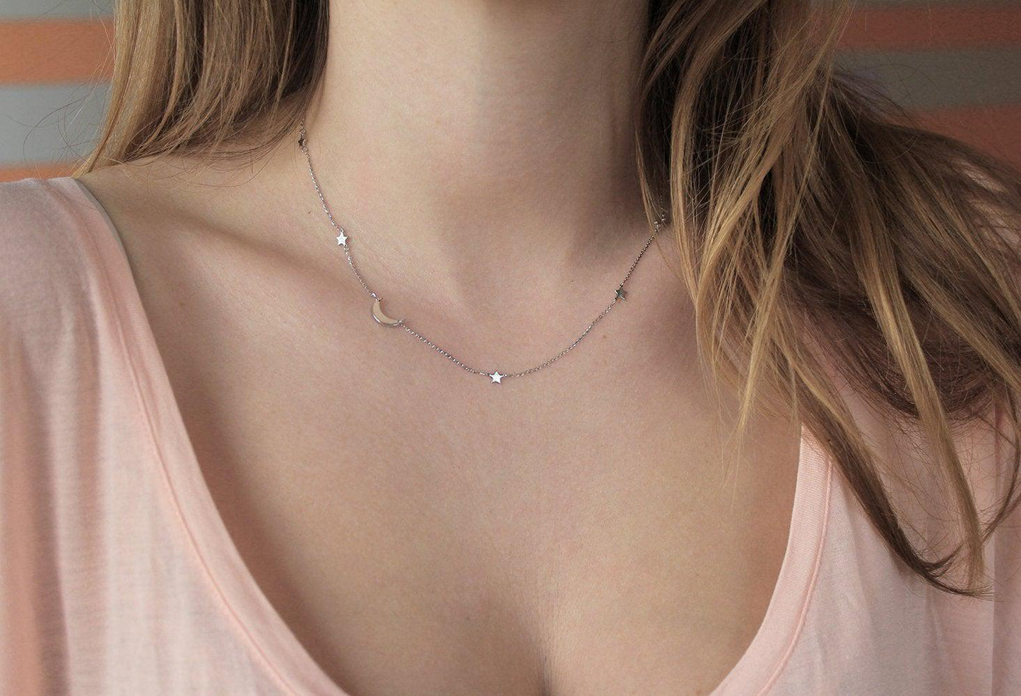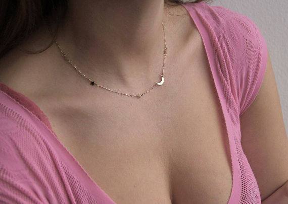 Sjajna ogrlica u obliku polumeseca i zvezda od 14k ili 18k zlata. Prekrasan poklon za godišnjicu za svakodnevno nošenje i kombinovanje sa vašim ogrlicama. Savršen poklon za vašu mamu za Dan majki.