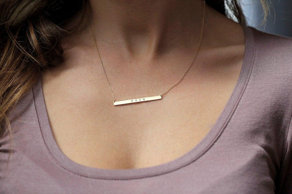 Jednostavna i elegantna ogrlica od 18k žutog zlata sa pločicom ukrašenom sa četiri dijamanta veličine 1.5mm. Moguće je dodati još dijamanata. Moderna i sofisticirana ogrlica za svaki dan.