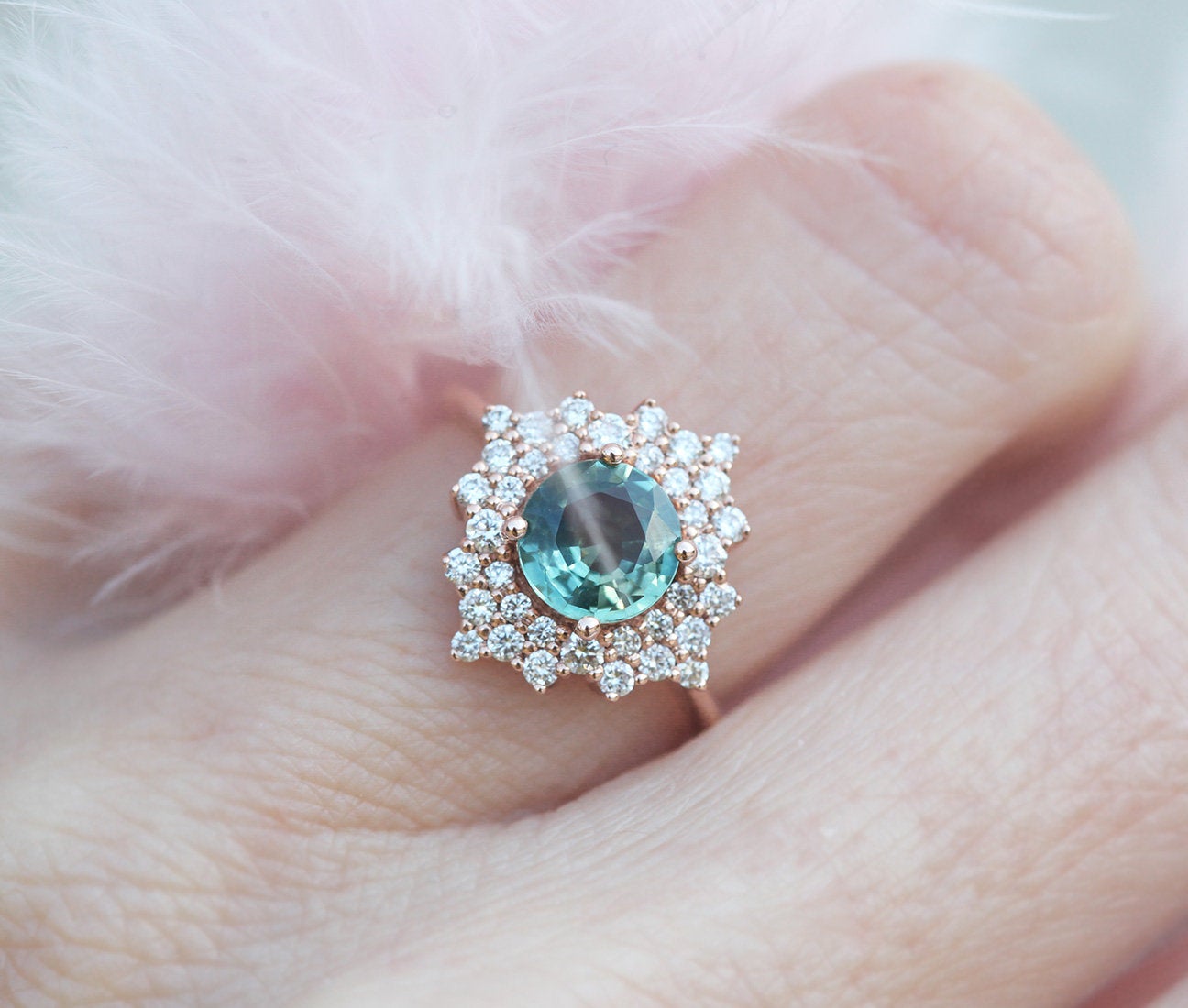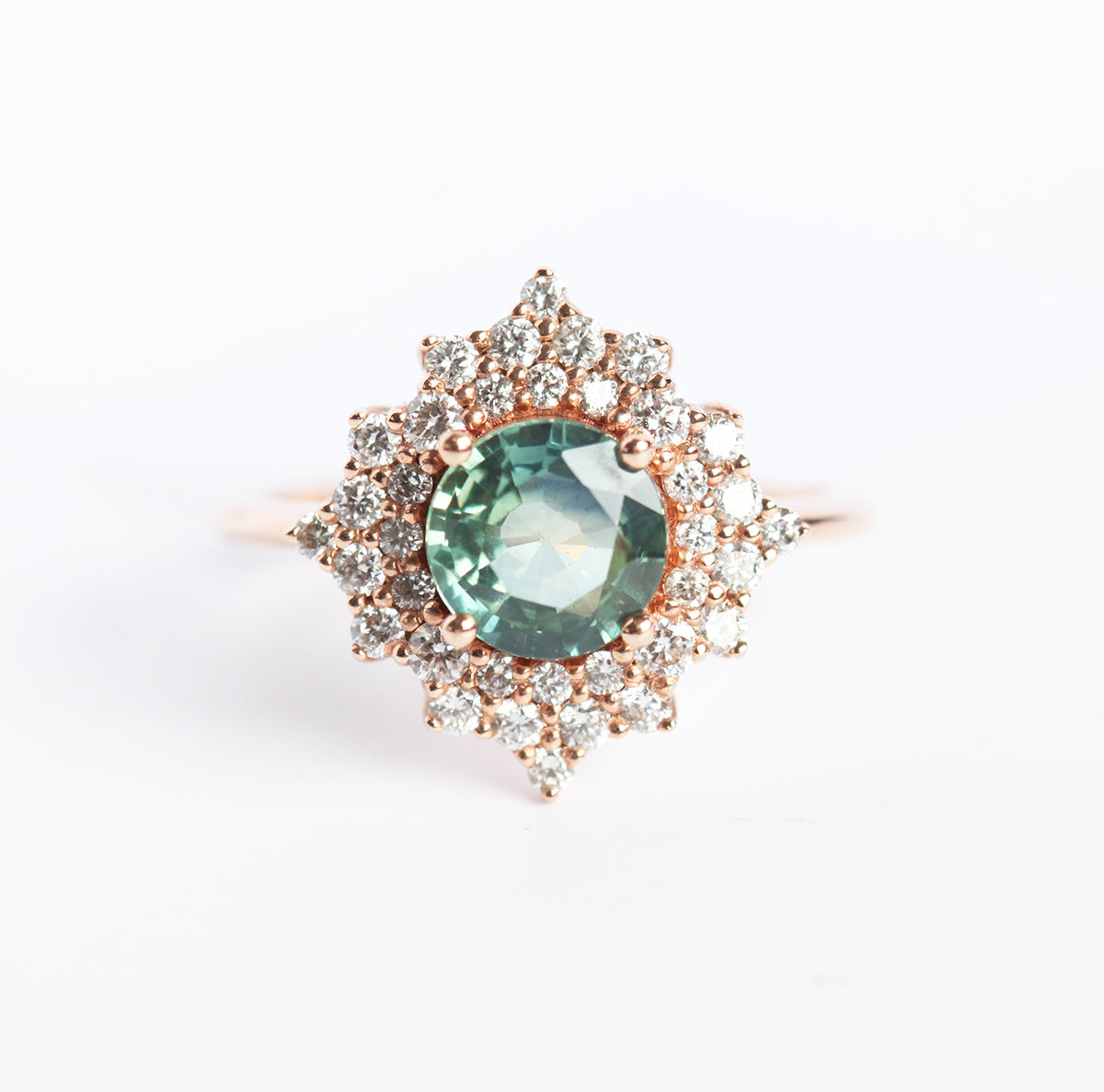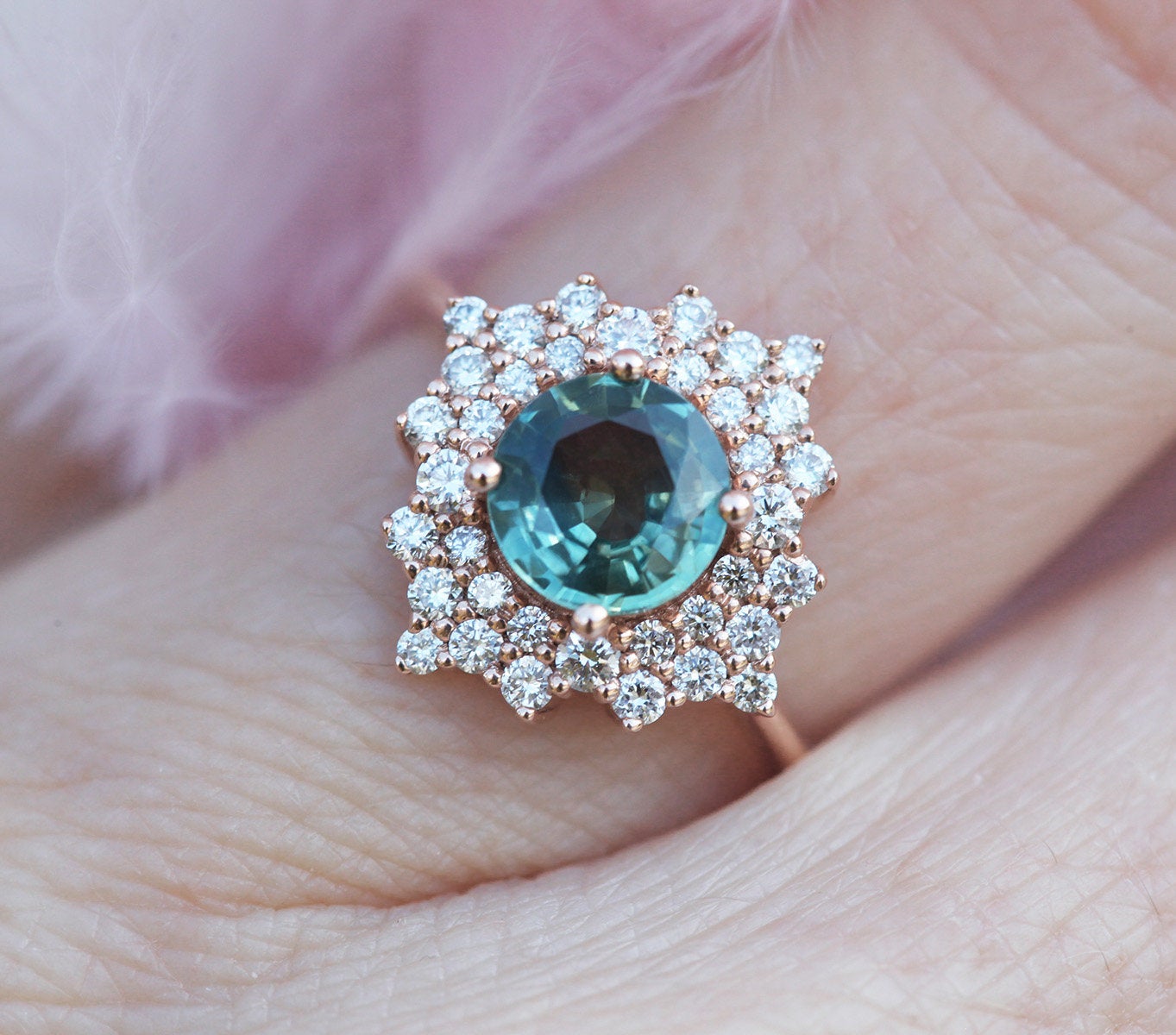 Ugođaj prolećne livade i sunčevih zraka koji se probijaju kroz travu – to su uspomene utkane u naš Patricia prsten. Sa prelepim okruglim teal safirom od 1,26ct i klasterom dijamanata, ovaj prsten je zaista jedinstven i savršen kao verenički prsten.