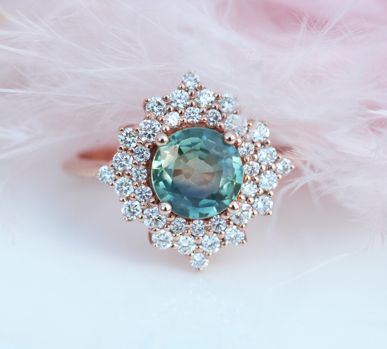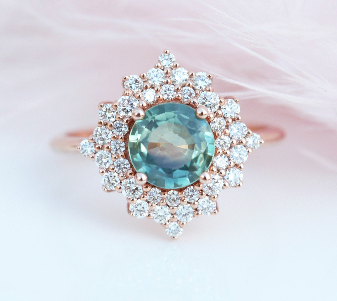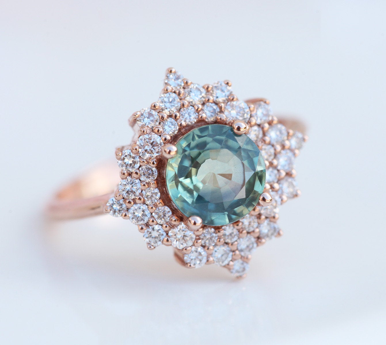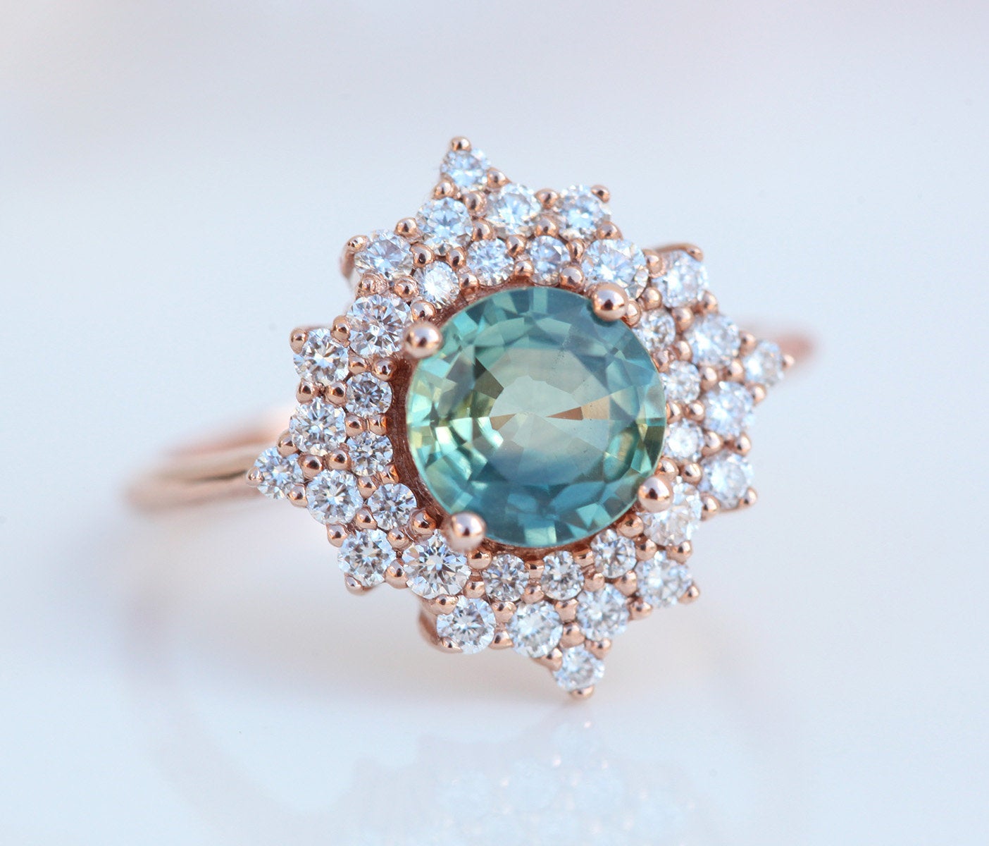 Ugođaj prolećne livade i sunčevih zraka koji se probijaju kroz travu – to su uspomene utkane u naš Patricia prsten. Sa prelepim okruglim teal safirom od 1,26ct i klasterom dijamanata, ovaj prsten je zaista jedinstven i savršen kao verenički prsten.