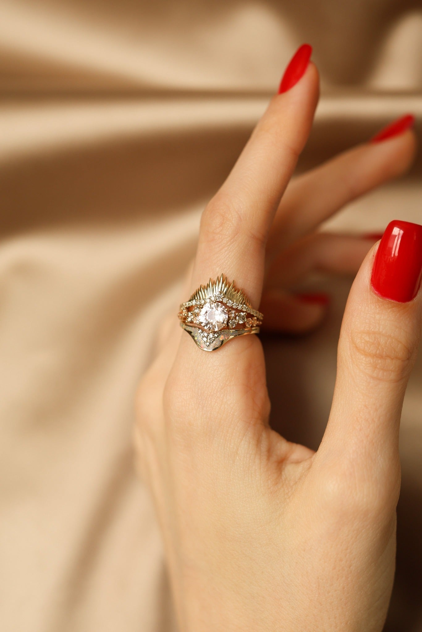 Cela kolekcija je dostupna ovde:Amalia peach sunset set prstenova, klaster safir set sa uklapajućim prstenovimaOvo je sertifikovani dizajn od Capucinne.