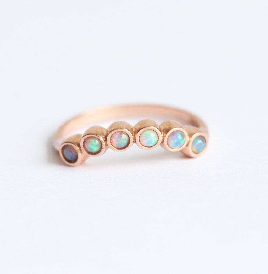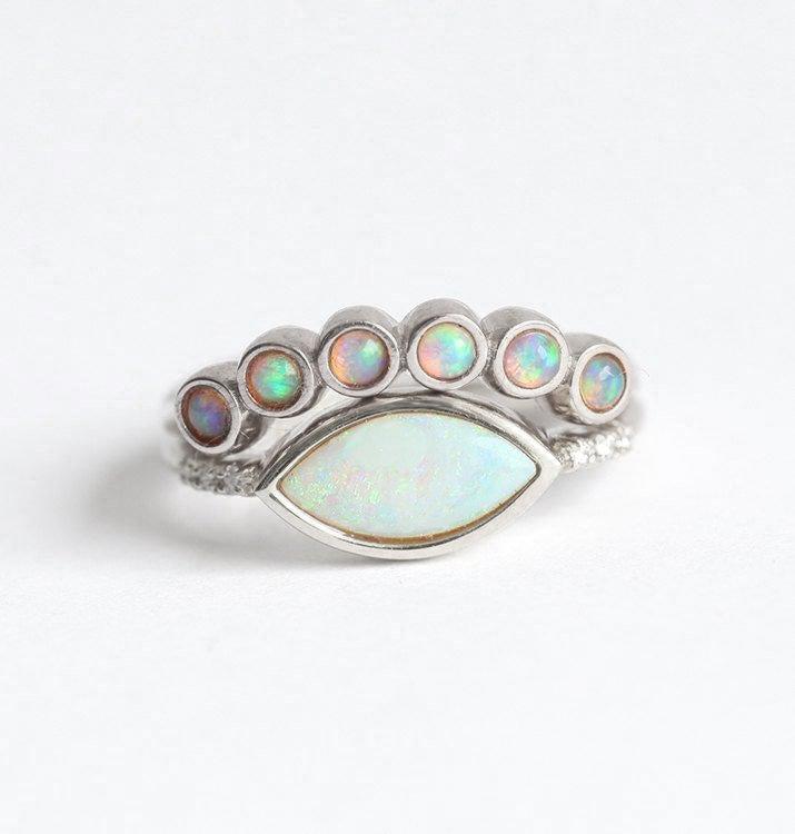 Opalni prsten ili set vereničkih prstenova koji se sastoji od zakrivljenog uklapajućeg prstena i prstena sa australskim opalom u marquise sečenju i sa bočnim dijamantima. Jedinstven set za mladu ili samostalni prsten koji se savršeno uklapa uz vaš verenički prsten.