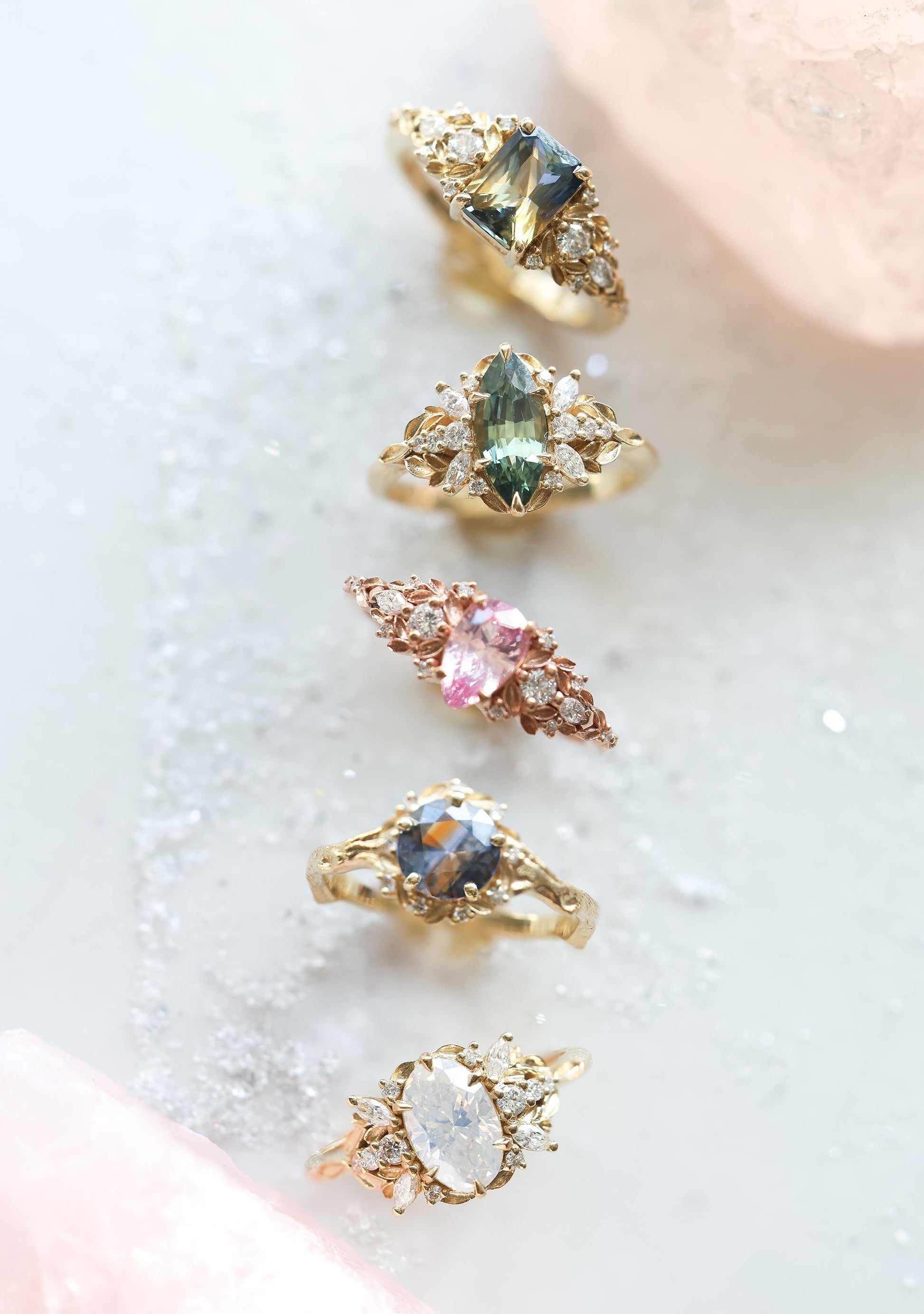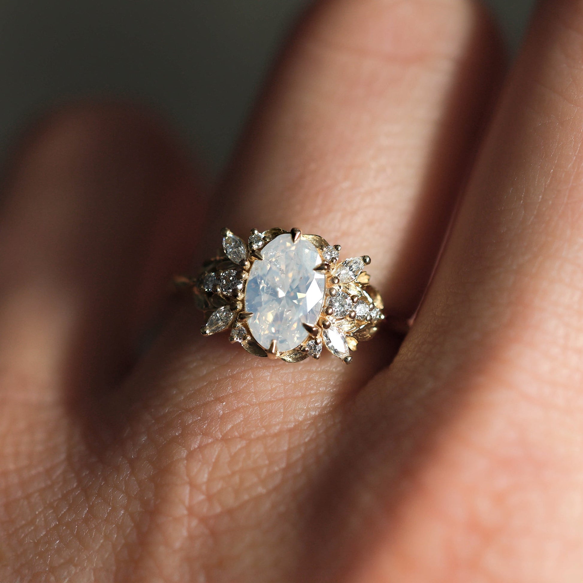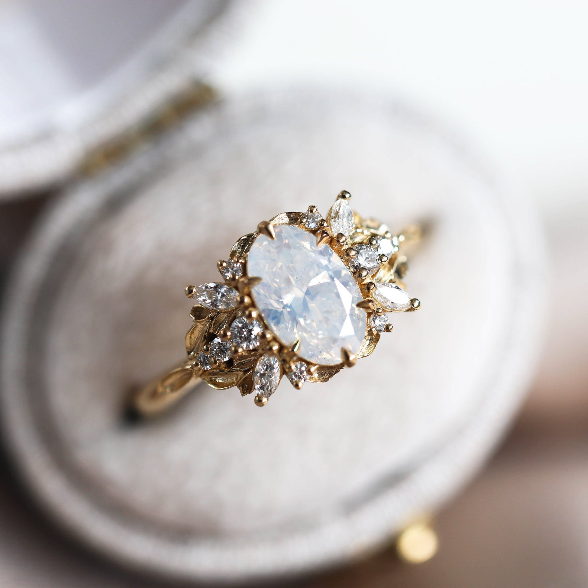 Jedinstven verenički dijamantski prsten sa mlečnim 1,05ct ovalnim prirodnim dijamantom i bočnim dijamantima oblikovanim u lišće. Dostupan i sa drugim dragim kamenjem.