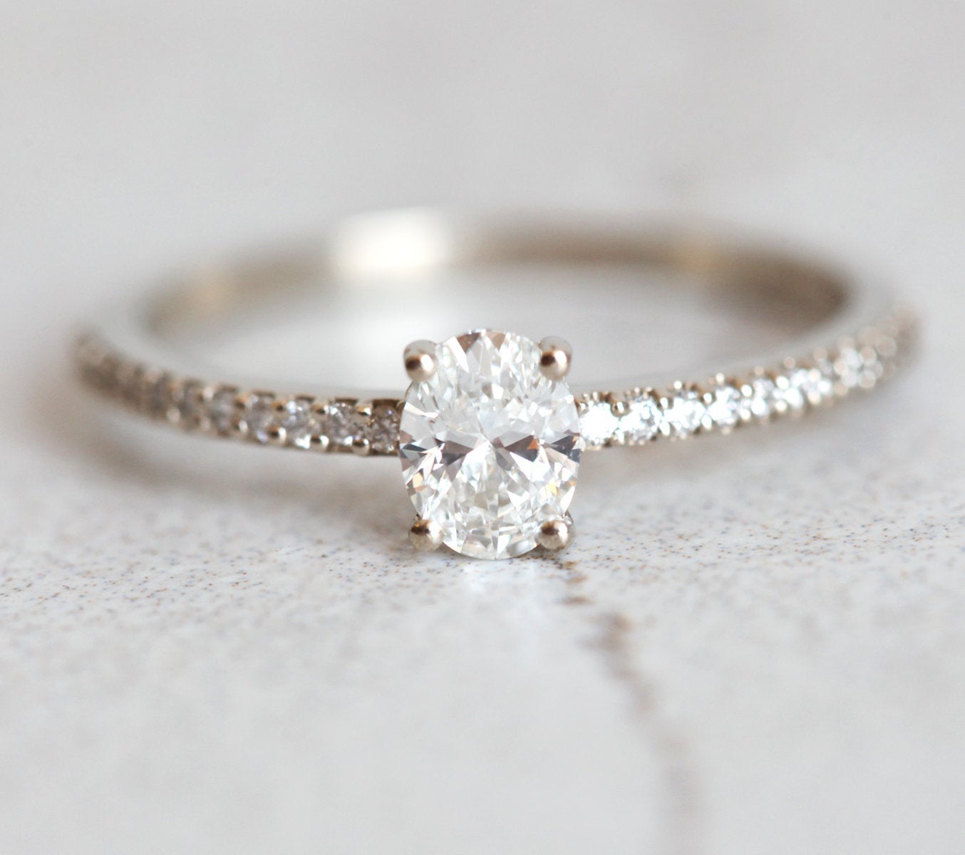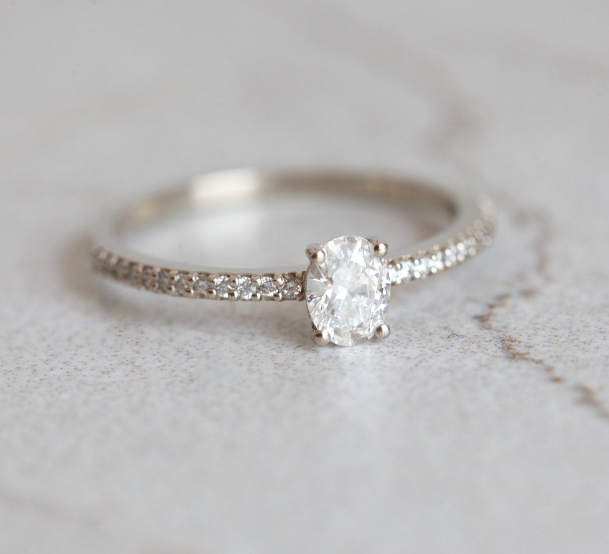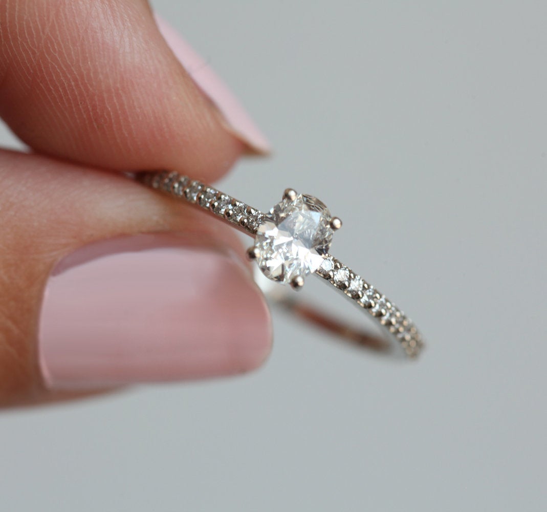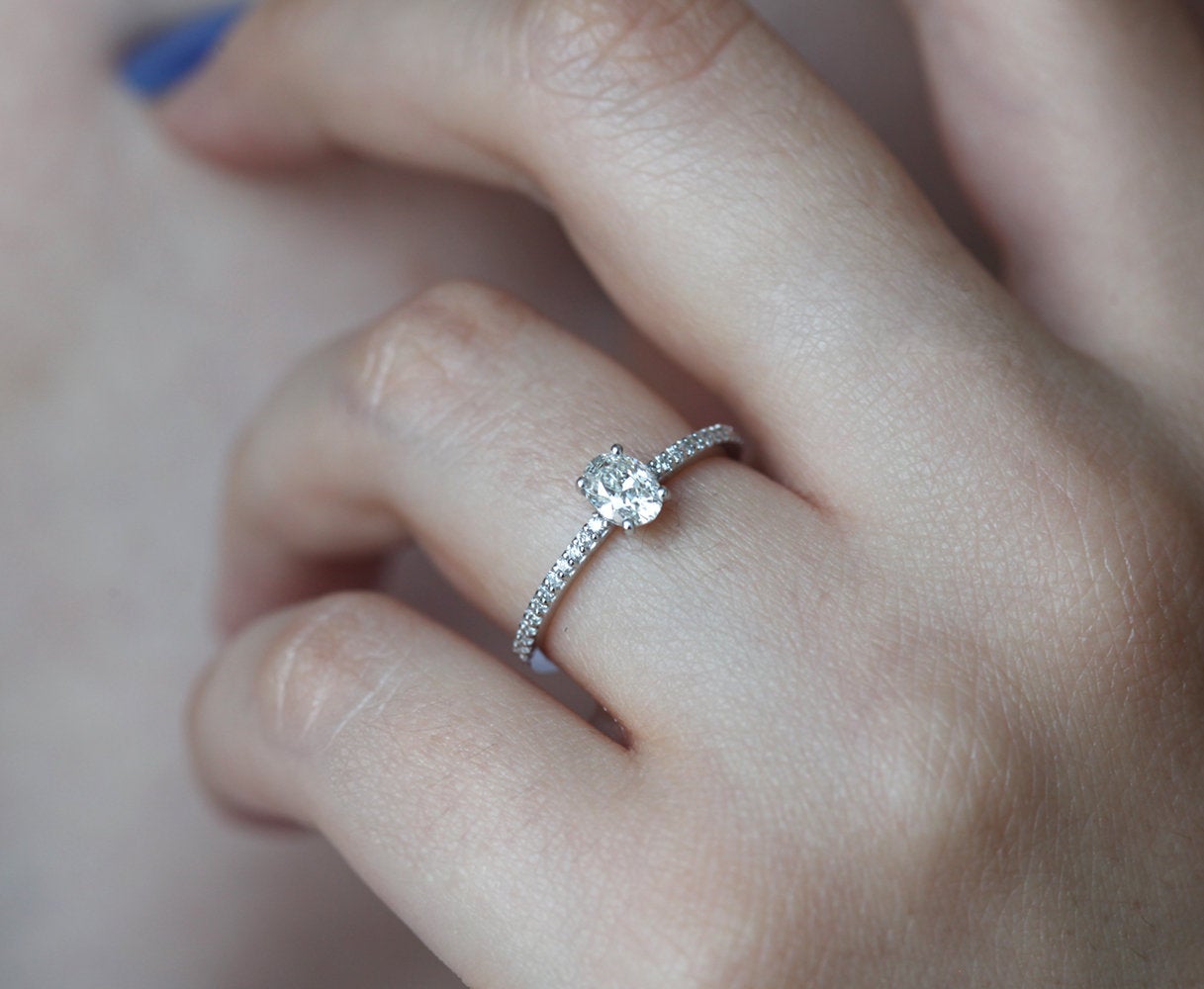 Belen je jednostavan i delikatan ovalni dijamantski prsten sa pavé trakom u polu večnom stilu koja donosi sjaj lepoti vaše voljene osobe. Listing prikazuje dijamant od 0.4ct. Molimo vas da izaberete težinu dijamanta iz menija.