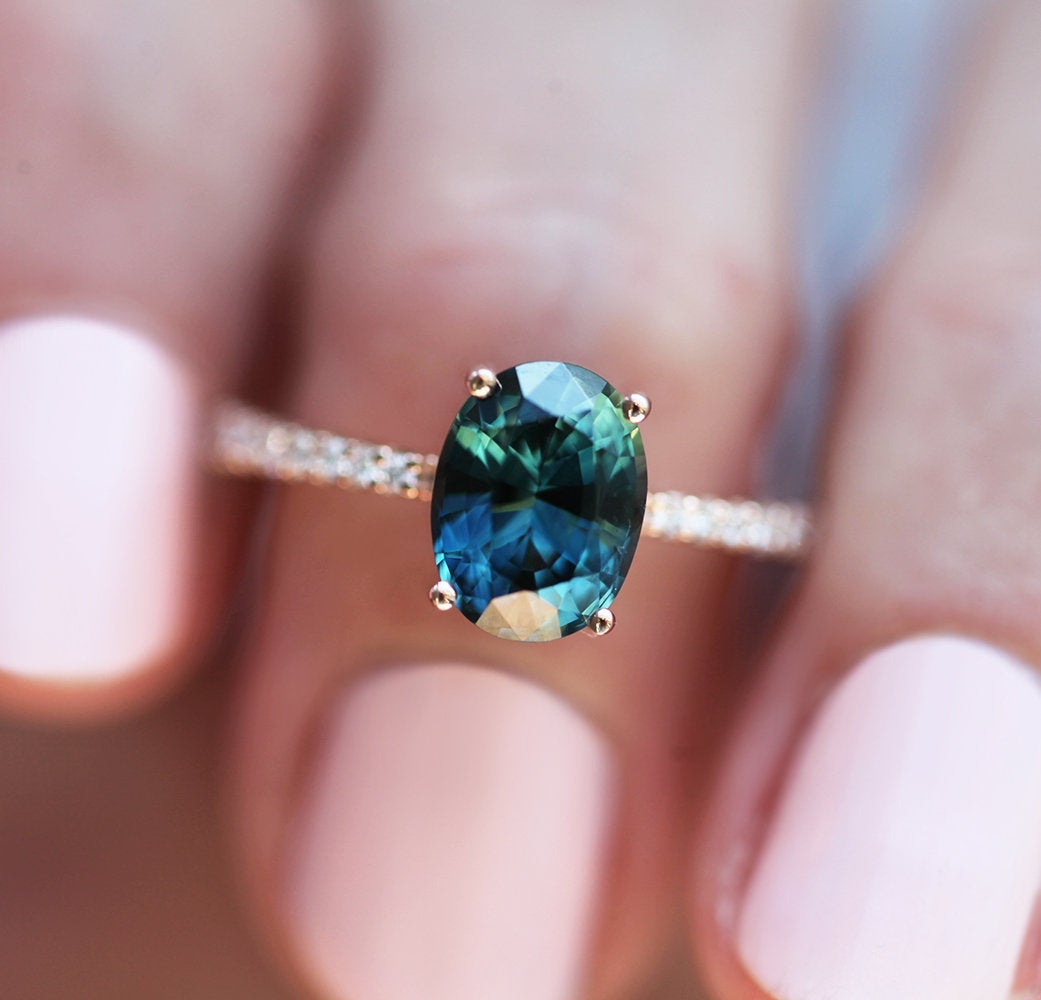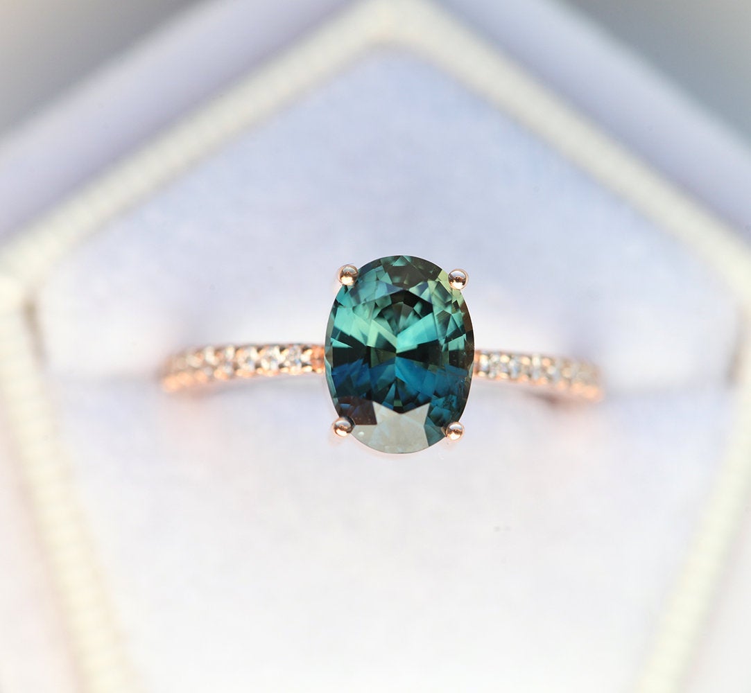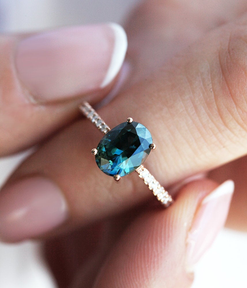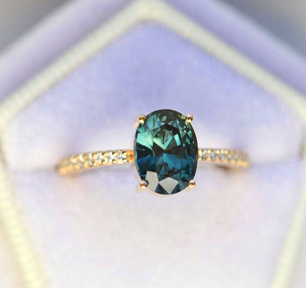 Ovaj prelepi verenički prsten sa ovalnim teal safirom i sjajnim dijamantima u pave postavci savršen je izbor za ženu koja voli elegantne i sofisticirane dizajne.