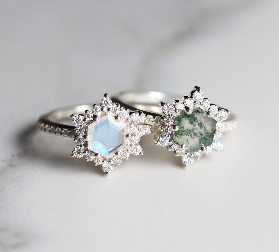 AYLA PRSTEN SA MOSS AGATE-OM U OBLIKU HEKSAGONA I DIJAMANTSKIM HALO-OM