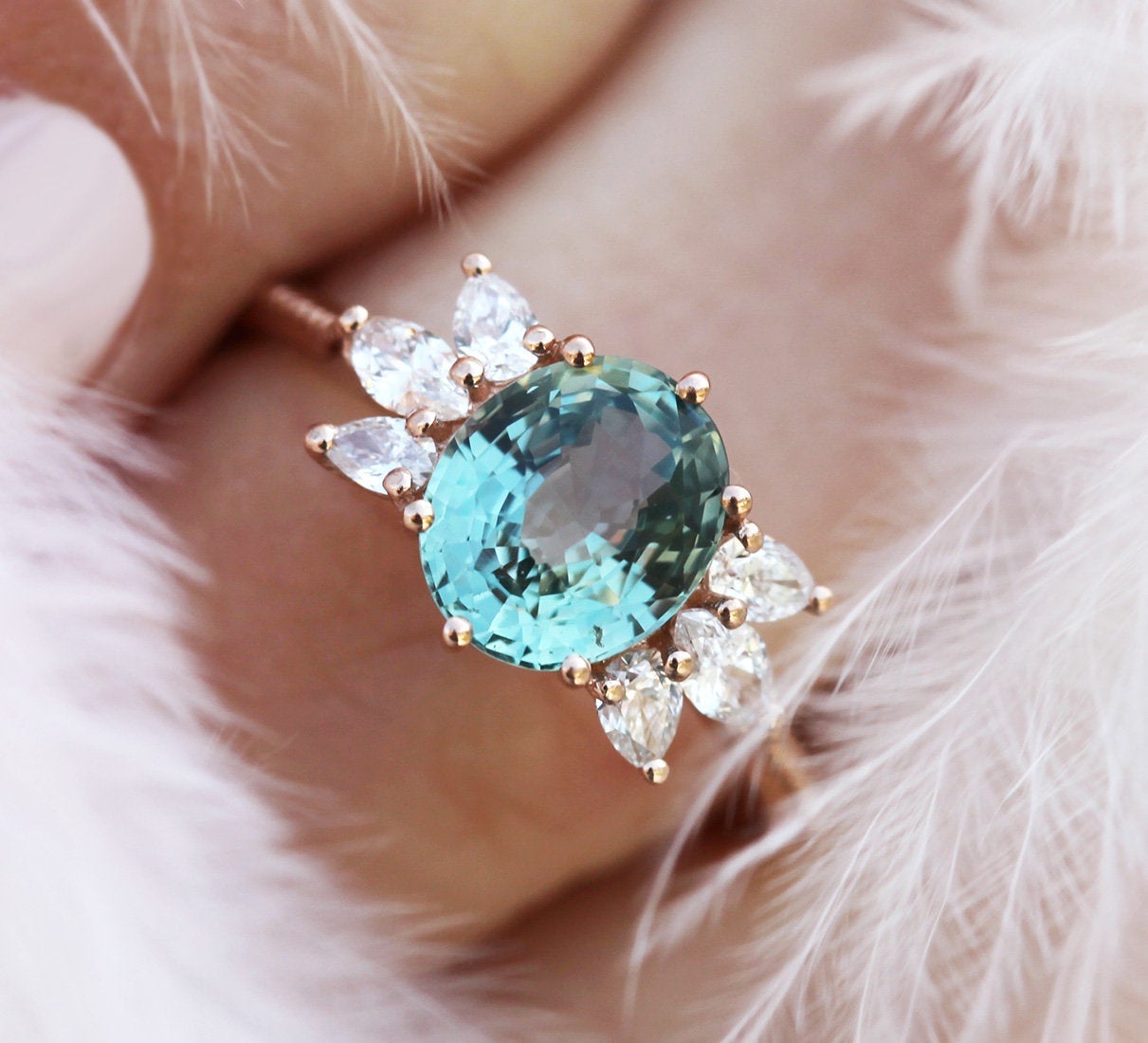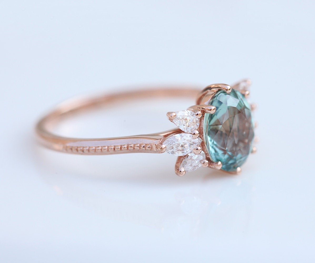 Sa 1.82ct Paraiba safirom i bočnim marquise dijamantima koji sijaju kao da nema sutra, naš Tracy prsten je stvoren da zrači pozitivnom energijom i lepotom. Predivan prirodni safir ima vibrantnu mint nijansu, koja je idealna da doda dašak boje vašoj vezi.