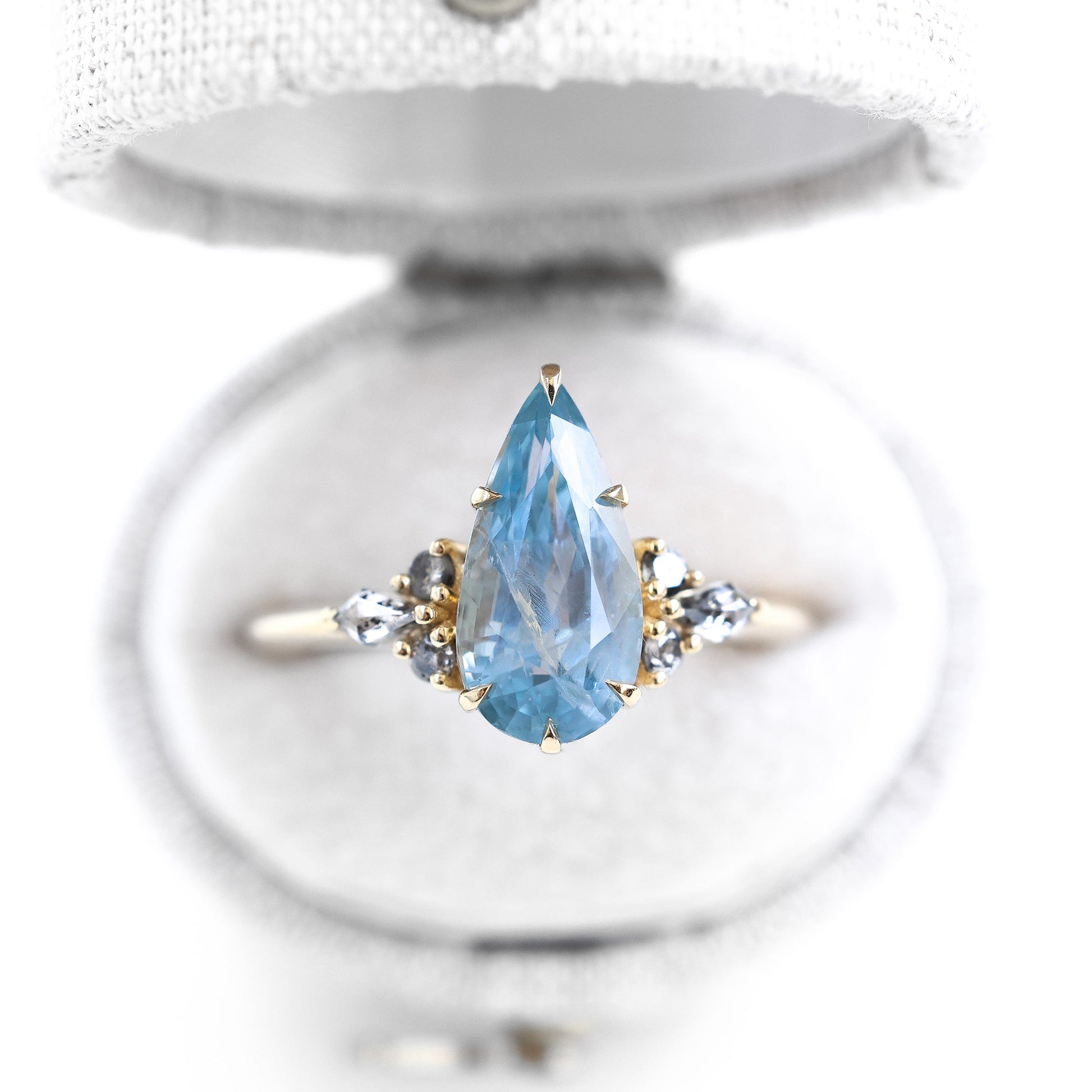 Prsten sa pear pastelno plavim safirom i salt and pepper dijamantima sa strane.