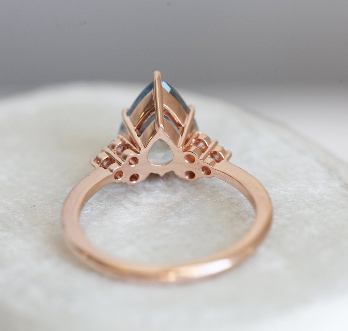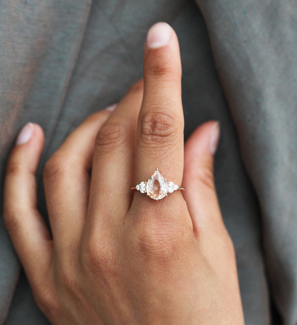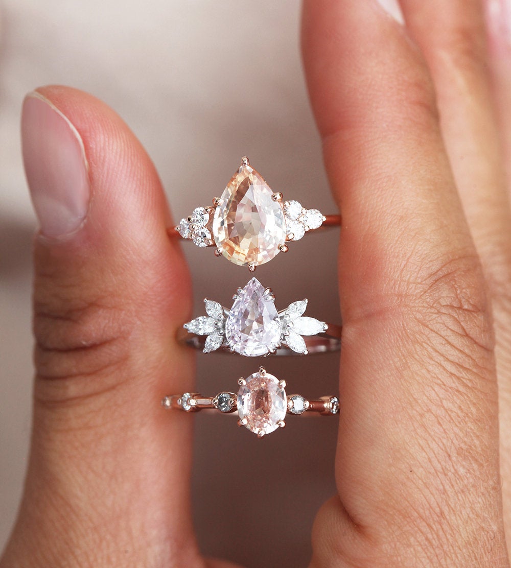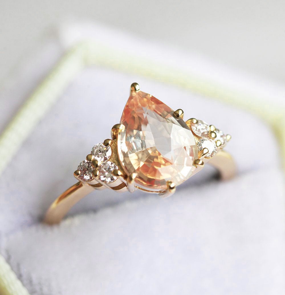 Prsten Jeanie je stvoren za žene koje cene tradicionalne dizajne. Sa pear sečenim safirom boje breskve kao centralnim kamenom i klasterom bočnih dijamanata, ovaj prsten privlači pažnju i zrači snagom. Vaša veridba nikada neće izgledati ovako sofisticirano.