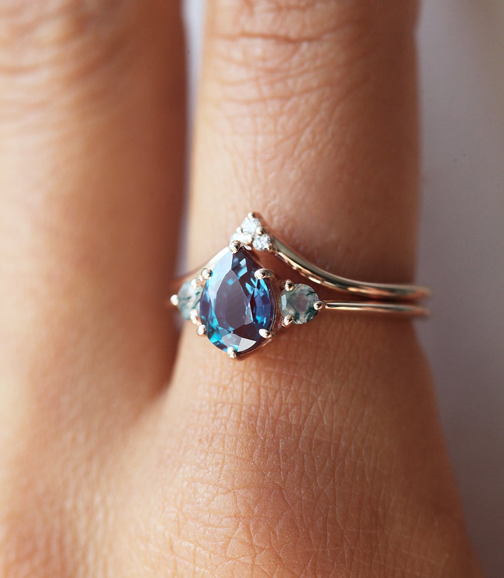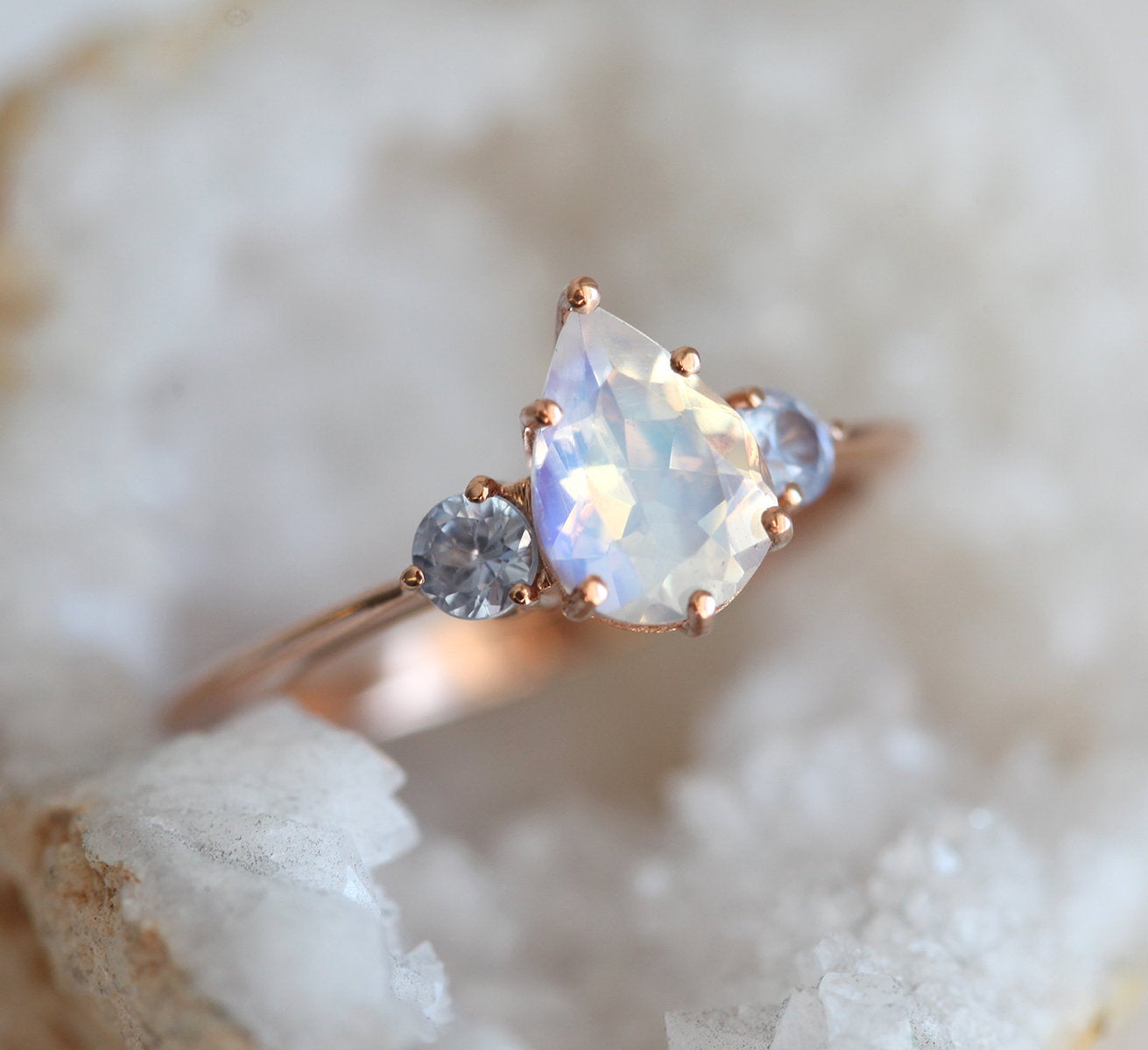 Evo još dva izuzetna komada za koje verujemo da će savršeno upotpuniti vaš stil: Prsten sa pear cut mesečevim kamenom duginih boja i svetloplavim safirima i Alexis prsten set sa "salt and pepper" dijamantom u obliku romba .