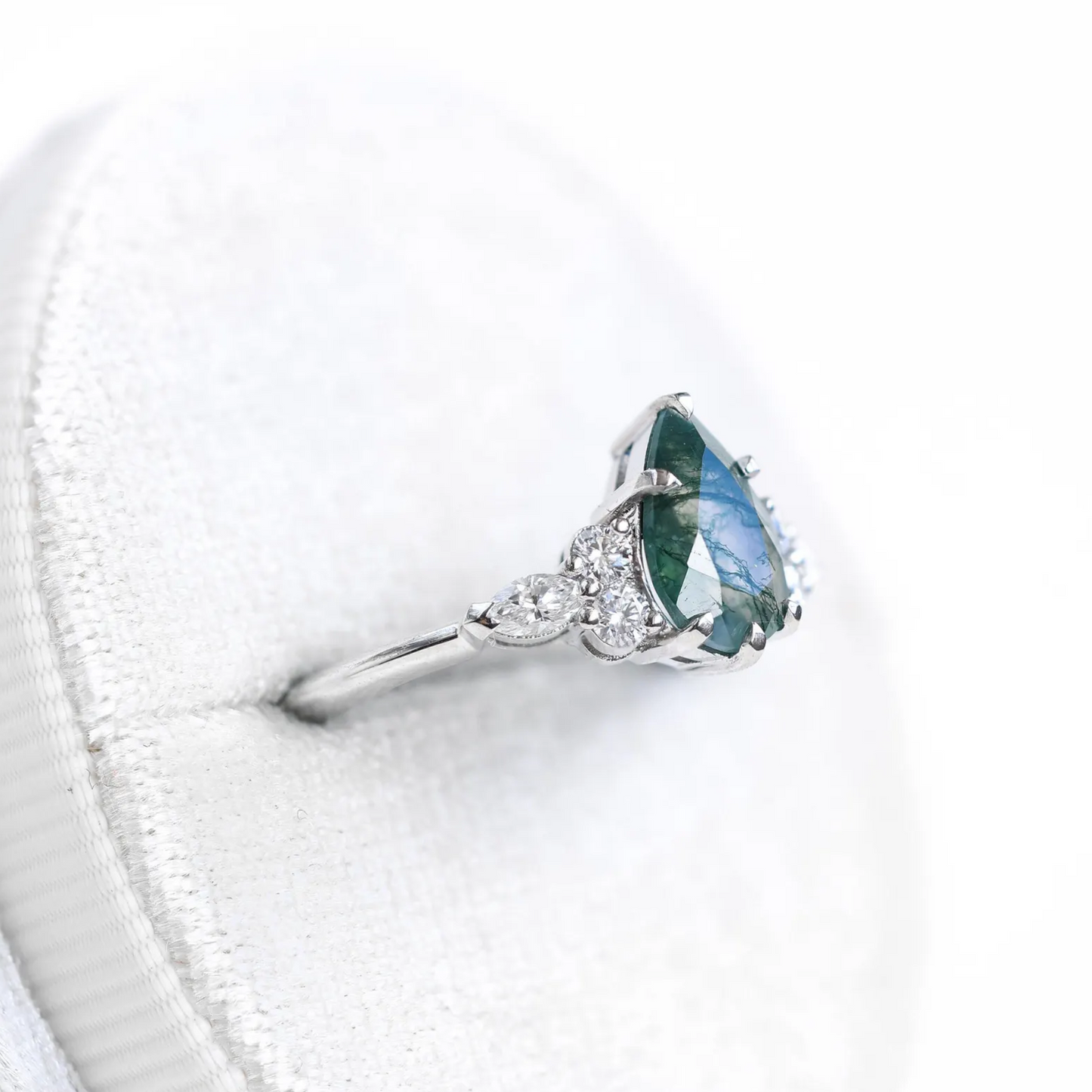 Pear Moss Agate prsten sa bočnim marquise dijamantima.