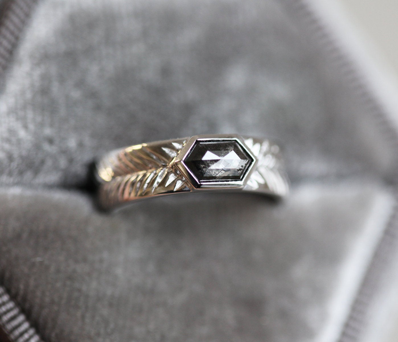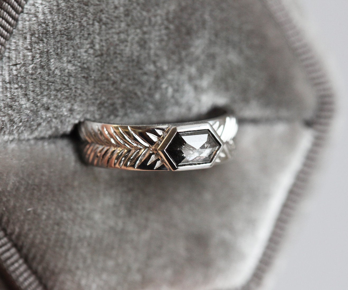 Uniseks dijamantski prsten sa "salt and pepper" heksagon dijamantom, na slici u 18k belom zlatu. Teksturisan dizajn koji odiše jedinstvenošću - savršen izbor i za njega i za nju.