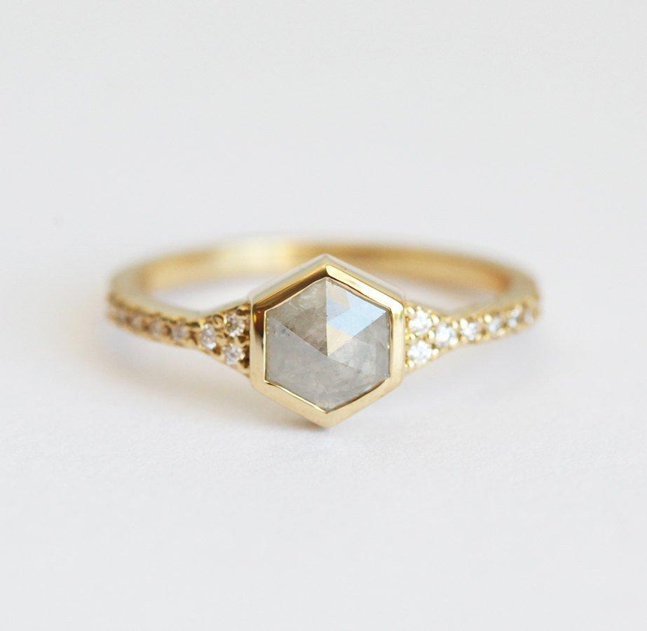 Prirodni srebrno-sivi heksagon salt and pepper dijamant postavljen u prsten sa dijamantima. Dijamant ima jedinstven i moderan oblik. Prsten može imati sjajnu ili mat završnicu.