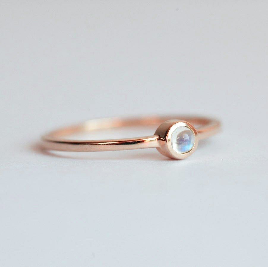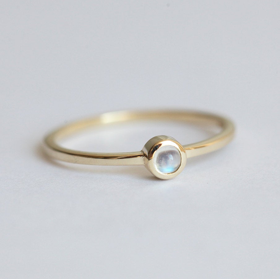 Nežan prsten od 14k žutog zlata sa mesečevim kamenom u duginim bojama kao centralnim kamenom. Savršen za svaki dan ili kao jednostavan verenički prsten.
