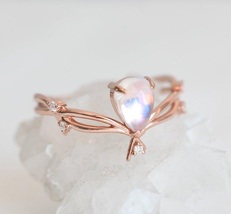 PRSTEN SA PEAR CUT MESEČEVIM KAMENOM U OBLIKU GRANČICE I SA DIJAMANTSKIM PUPOLJCIMA