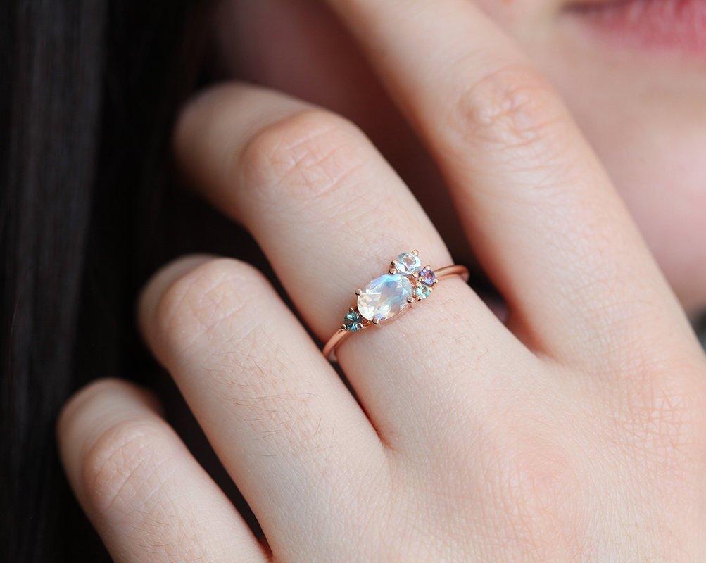 Prelep prsten sa mesečevim kamenom u klaster dizajnu, idealan kao verenički prsten, poklon za majke ili kao prsten sa kamenom rođenja, ukrašen safirima i tanzanitom.