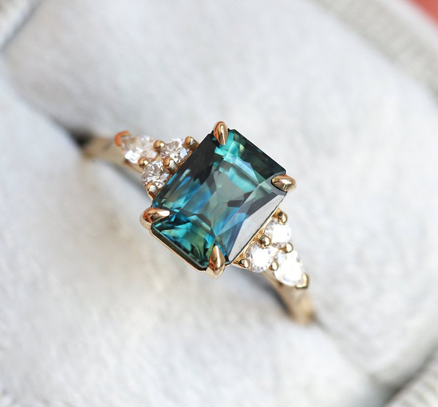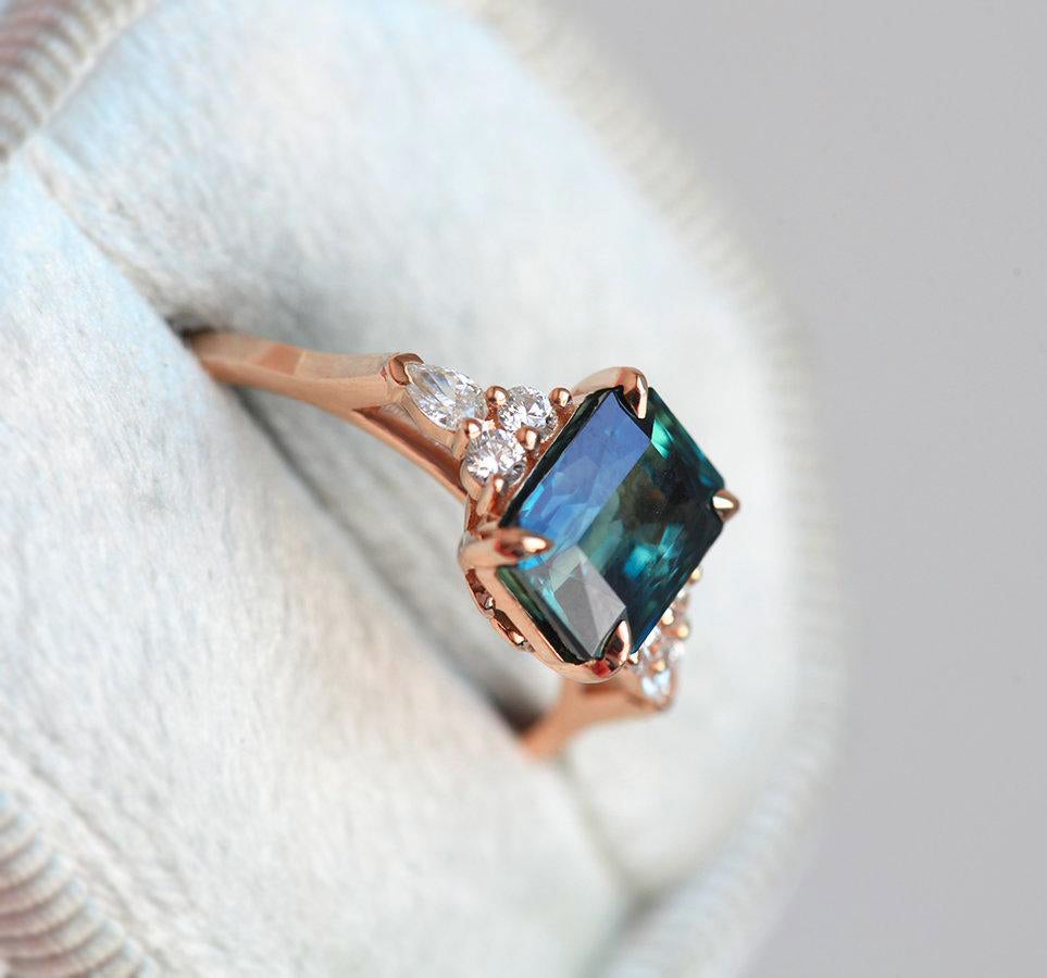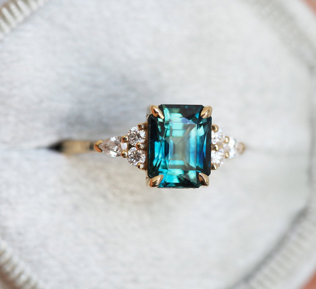 2,6ct radiant cut savršenstva – ovaj prelepi teal safir prsten sa bočnim dijamantima sigurno će vam popraviti raspoloženje. Sa tako bogatom bojom, savršen je kao verenički prsten koji se može nositi i kao koktel prsten za završni dodir elegancije.