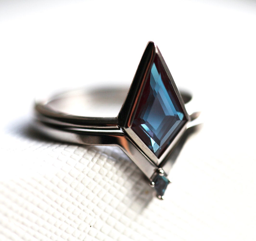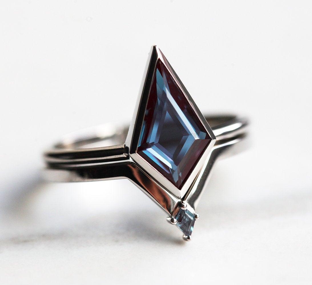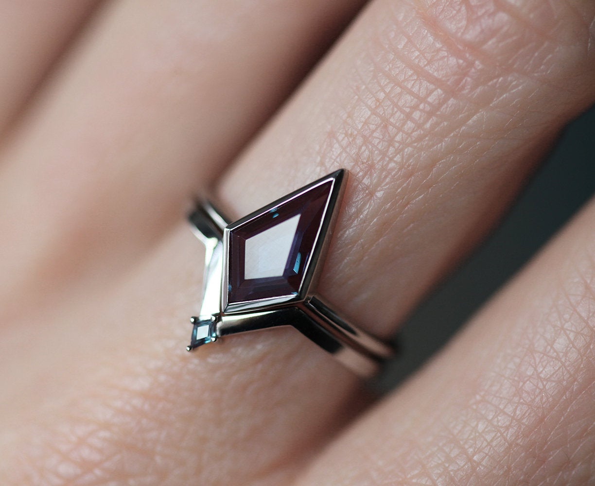 Zara je elegantan i prelep prsten sa laboratorijskim aleksandritom sa modernom notom luksuza. Kamen u romb obliku savršeno je uklopljen u minimalistički dizajn prstena ili seta prstenova.