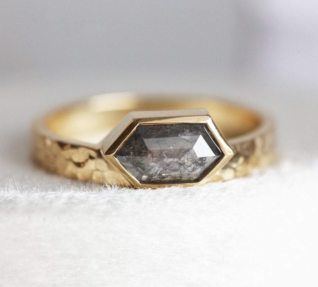 Amber je idealan komad nakita kojim možete obradovati voljenu osobu. Sa jedinstvenim dijamantom u heksagon obliku, ovaj prsten od 18k zlata blista na ruci dame. Prsten je kovan i može biti gladak i poliran, mat ili sa teksturom.