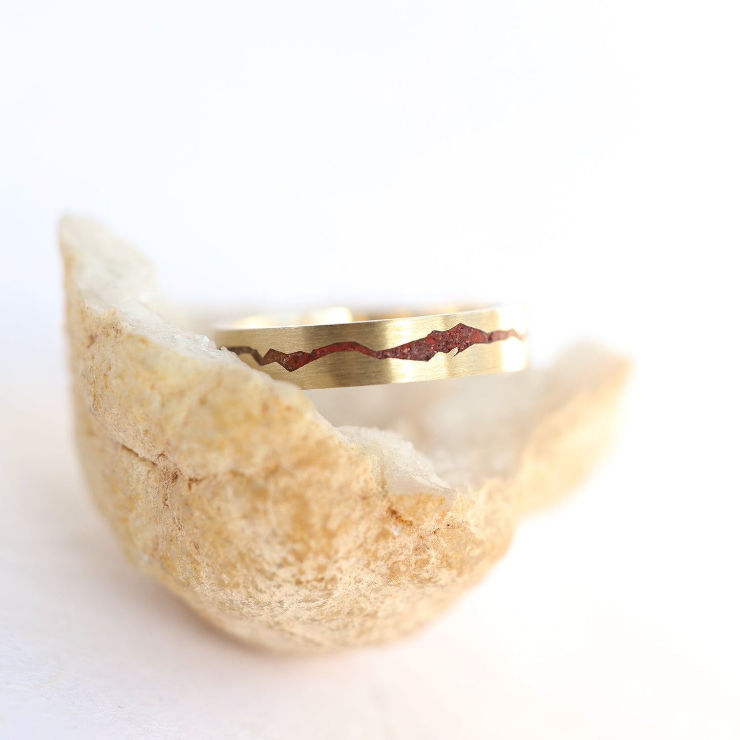 Ovaj jedinstveni prsten sa inlej detaljem planinskog lanca od drobljenog crvenog jaspisa idealan je izbor za ljubitelje prirode i planina.