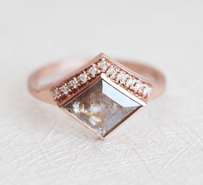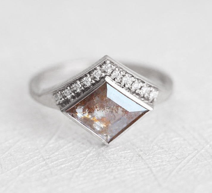Raido je jedinstven, moderan geometrijski verenički prsten sa kite salt & pepper dijamantom i pavé belim dijamantima.