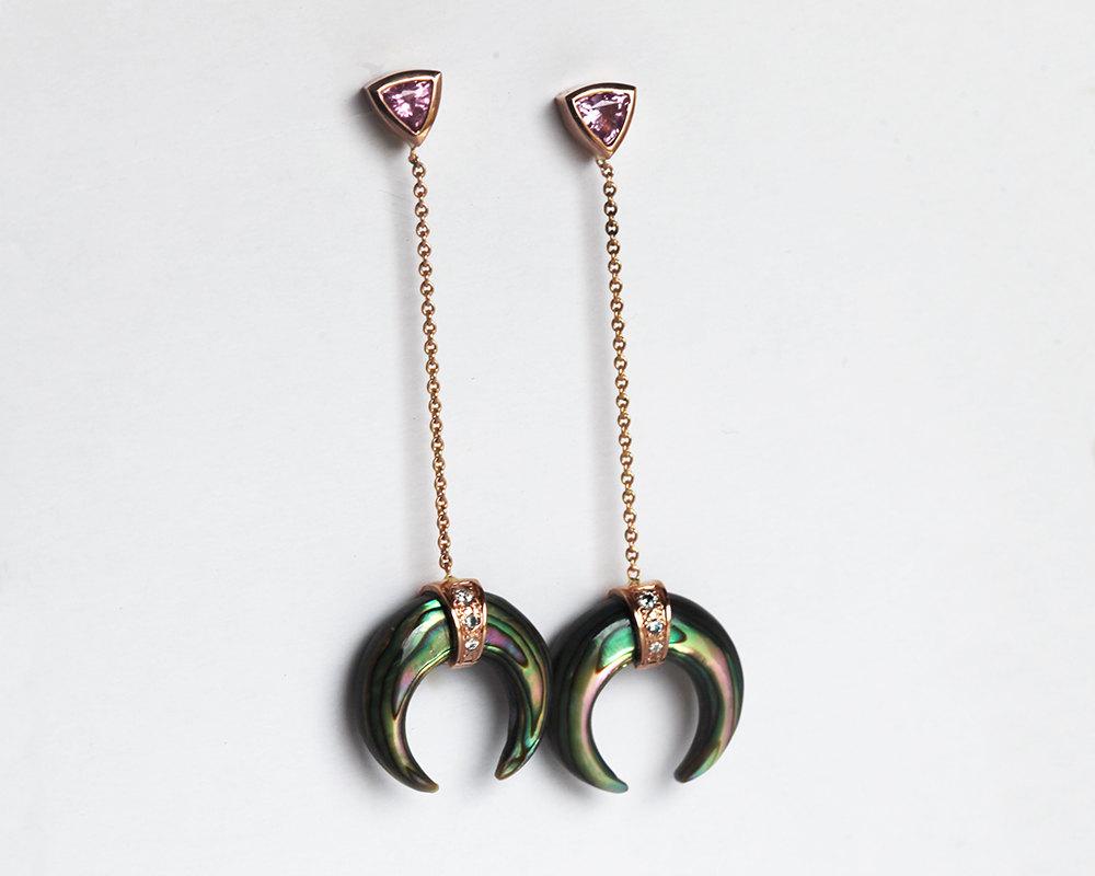 Poseban i jedinstven par minđuša od prirodnih abalone školjki u obliku polumeseca u 14k punom roze, žutom ili belom zlatu. Duži deo je od školjke u obliku roga ukrašen belelim dijamantima, povezan lancem od punog zlata sa bezel postavljenim studom od ružičastog safira u obliku triliona.