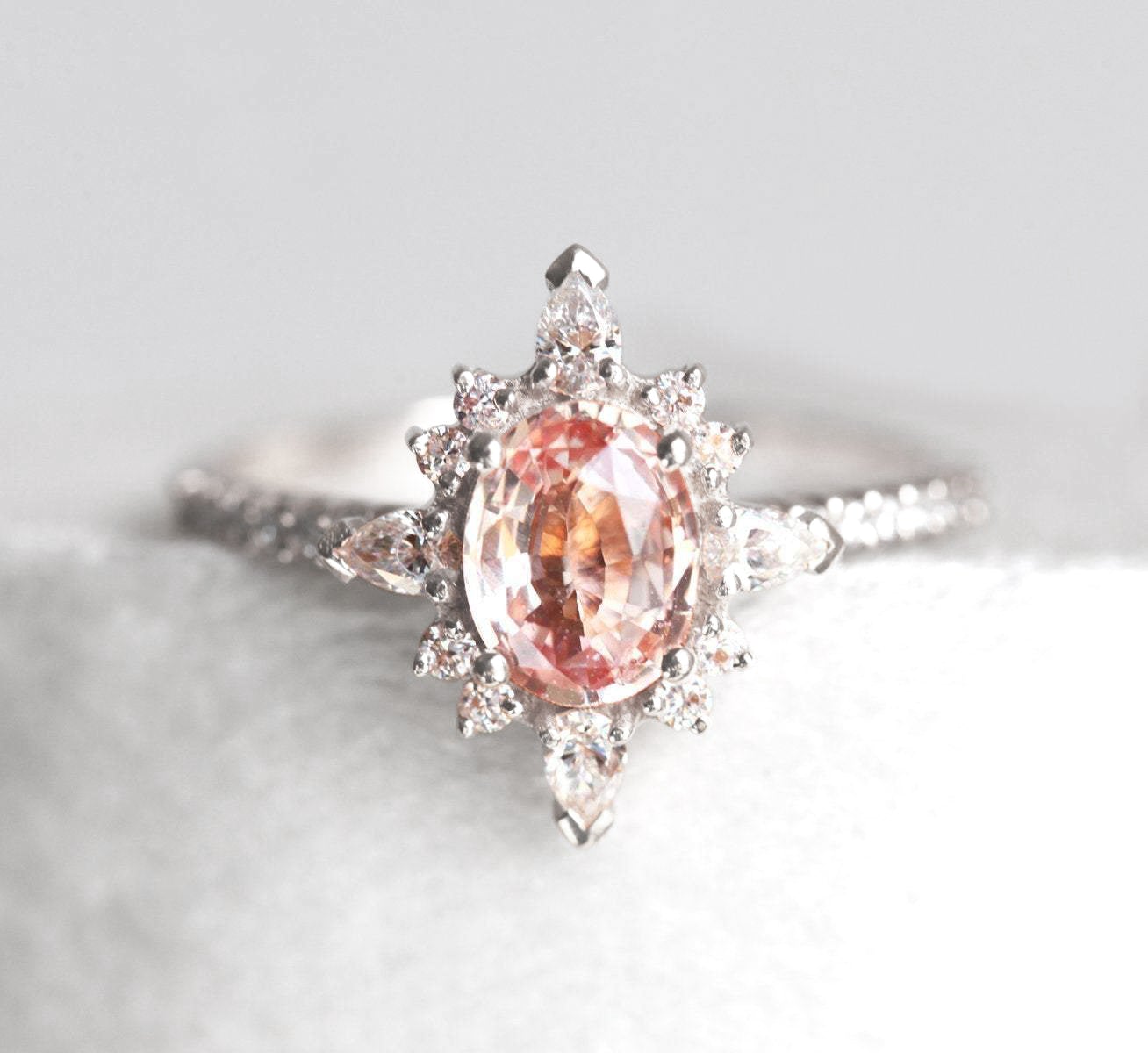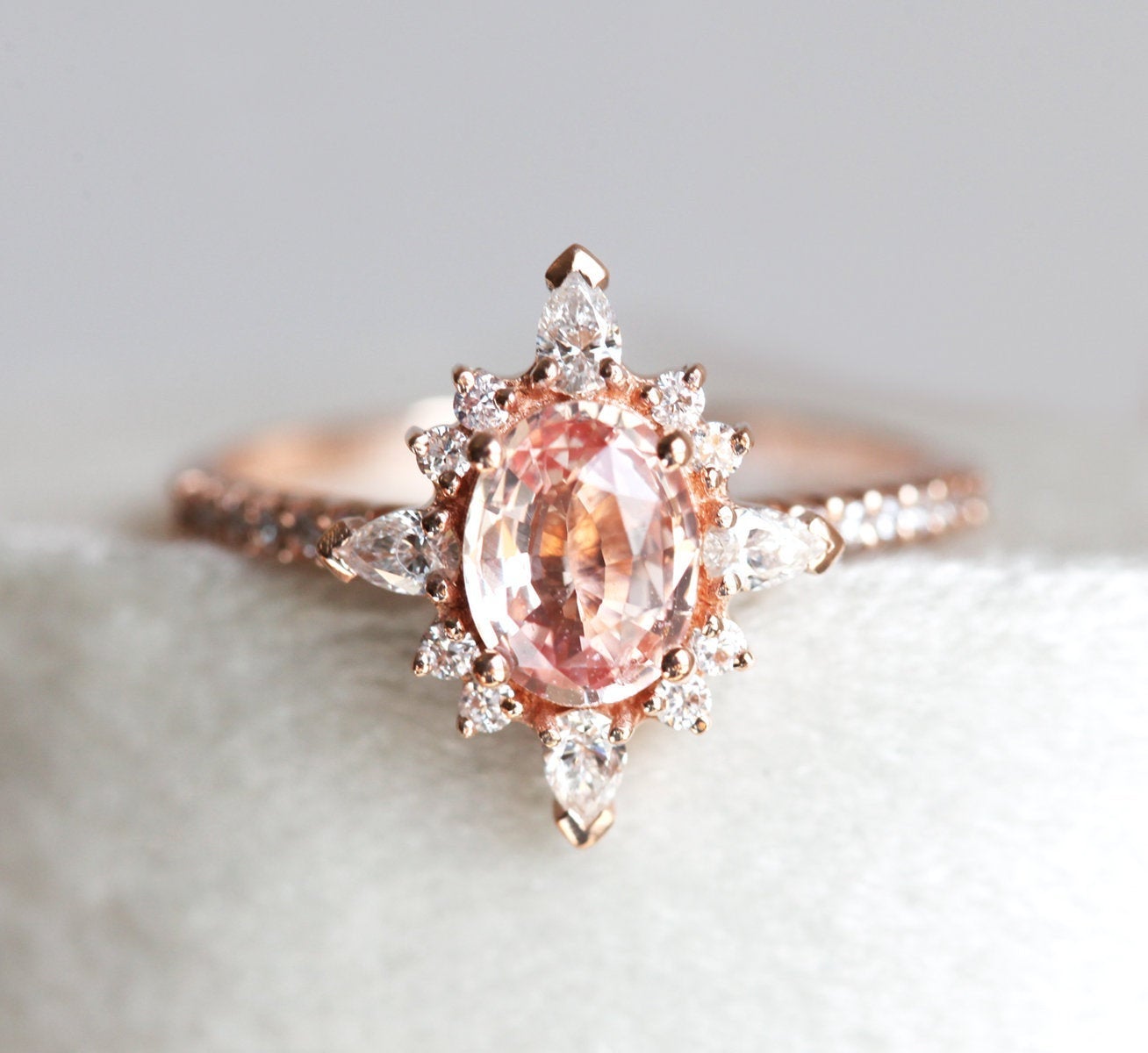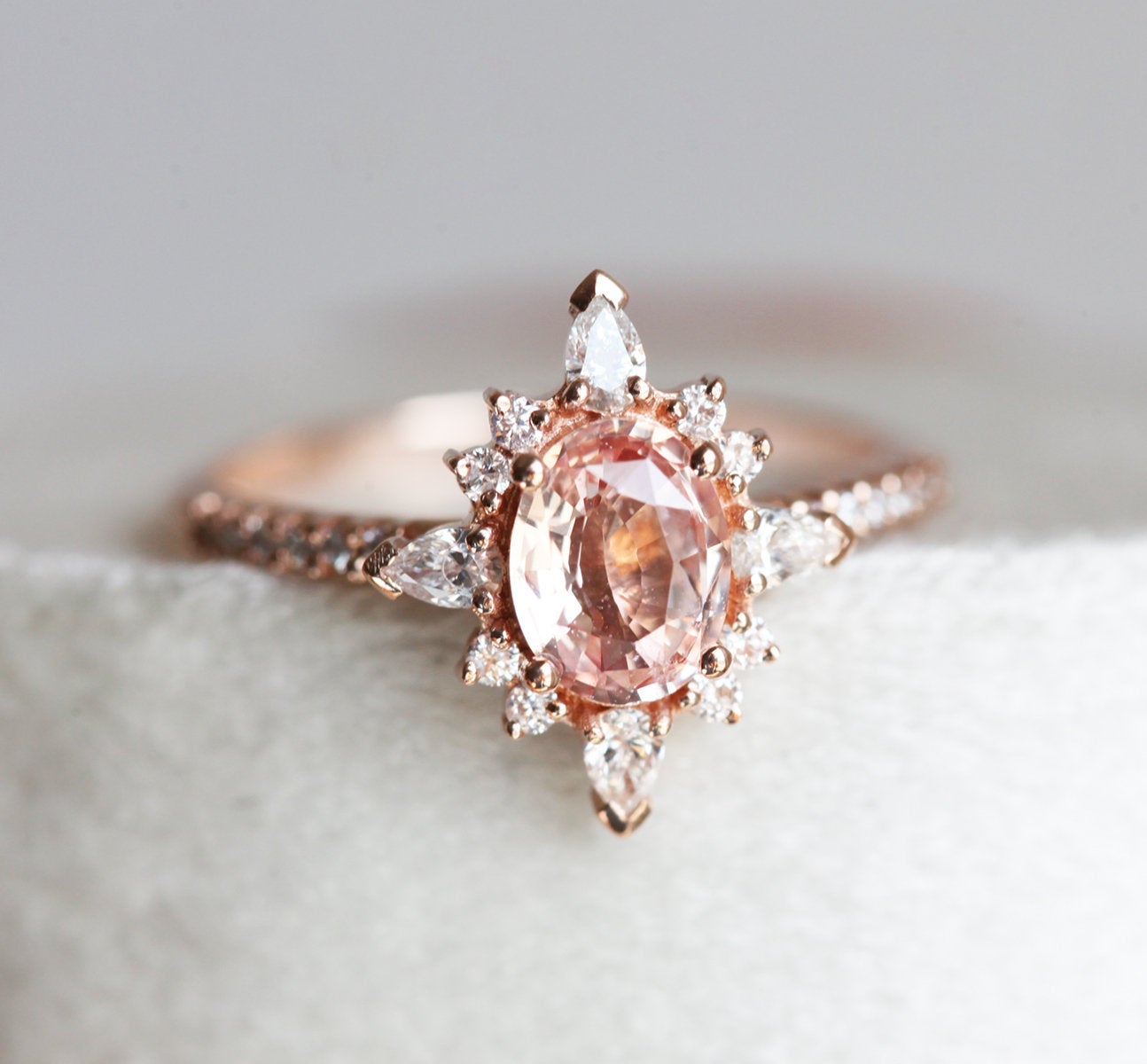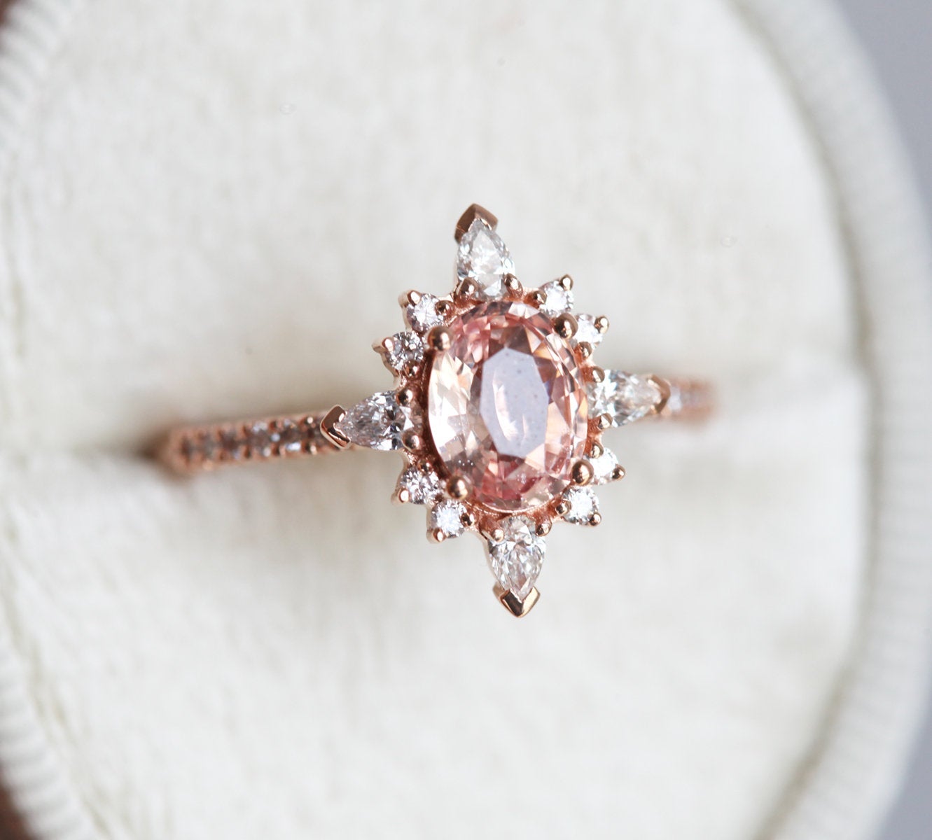 Vintage inspirisan prsten sa breskvasto-roze safirom i marquise dijamantima. Klasična elegancija u modernom obliku.