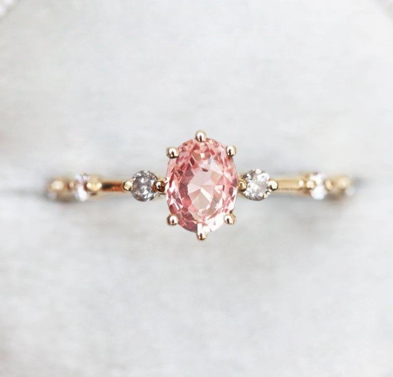 Ophelia prsten kombinuje breskvasti safir sa belim i salt & pepper dijamantima. Harmoničan i elegantan dizajn, savršen za sofisticirane dame.