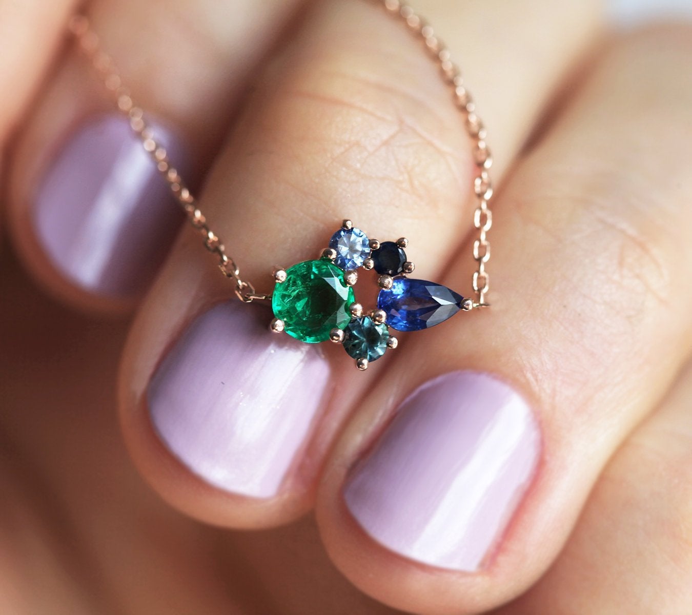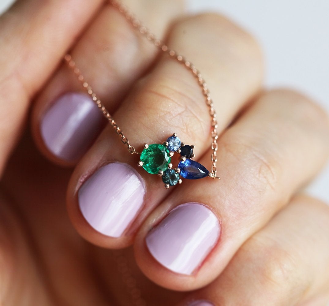 Sjajna klaster safir ogrlica sa smaragdom i safirima. Šarena i elegantna, savršena ideja za poklon posebnoj dami u vašem životu – partnerki, majci, sestri...