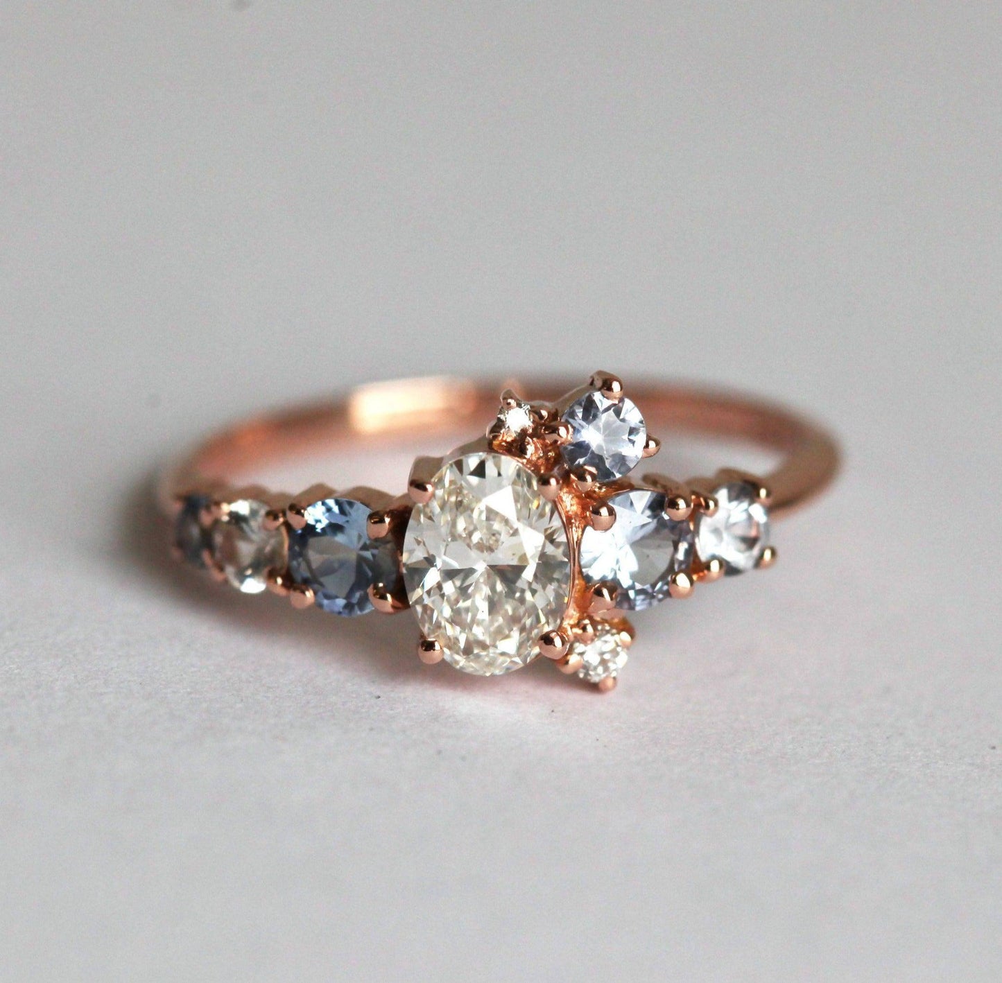 Jago prsten sa ovalnim dijamantima i safirima u klaster dizajnu