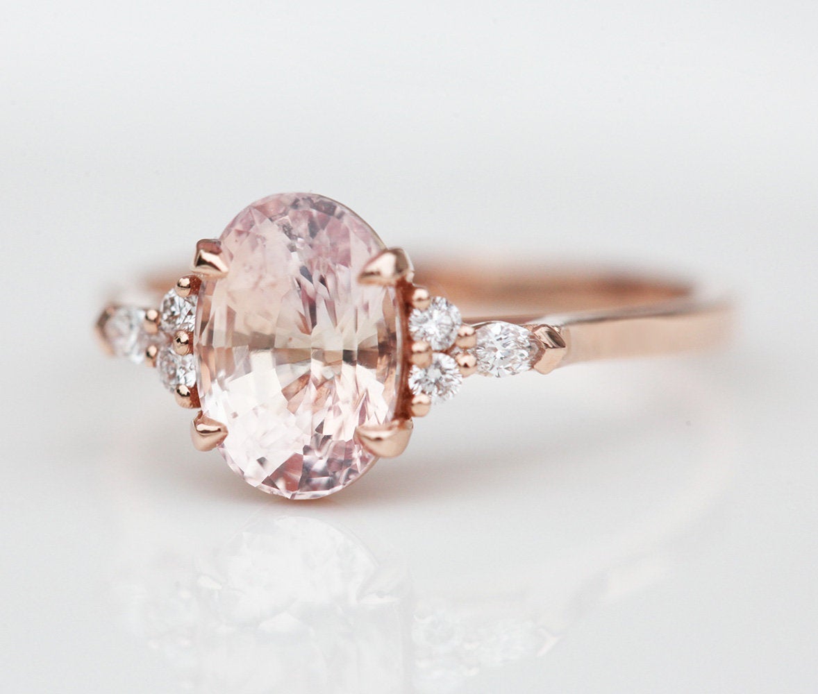 Naš Alessandra prirodni peach safir prsten sa bočnim dijamantima očaraće vas u trenu. Sa najlepšom nijansom breskva safira, uklapa se uz svaku boju tena i izmamljuje osmeh svakoj dami koja ga nosi. Savršen je kao verenički prsten ili burma, napravljen da vaš poseban dan učini nezaboravnim.