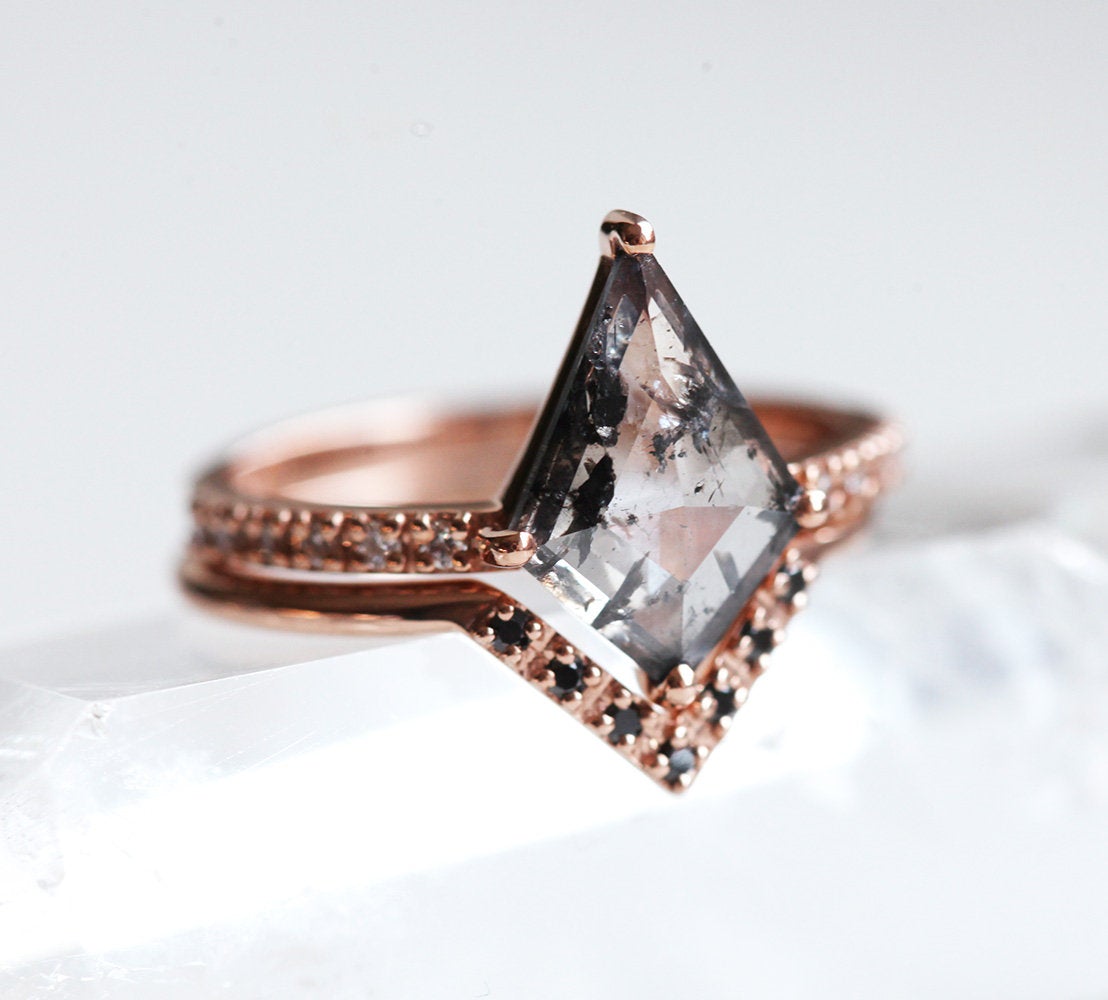 Prelep i sjajan kite dijamantski prsten i uklapajući V oblik prsten. Geometrijski dizajn ovog vereničkog prstena daje mu savremeni izgled. Elegantan kite dijamant sa dijamantskim pave prstenom prelepo se uklapa sa uklapajućim dijamantskim prstenom, koji savršeno dopunjuje ceo dizajn.