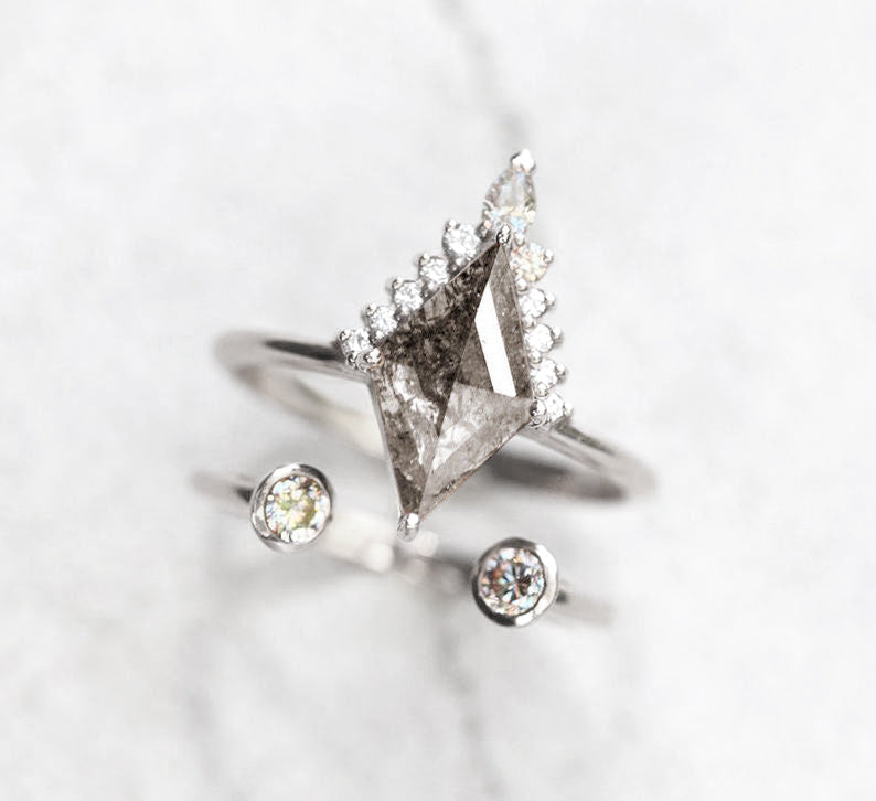Salt and pepper dijamantski prsten. Sa kite sečenim sivim dijamantom, dva dijamanta na kraju uklapajućeg prstena stvaraju upečatljiv efekat i pružaju složenost dizajnu, čineći ovaj set jedinstvenim izborom za vaš poseban dan.