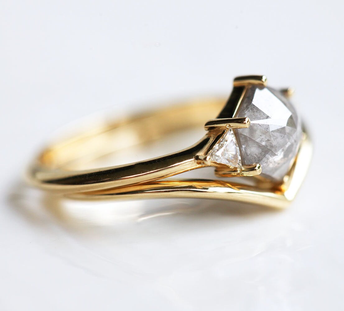 Bilo da je za vašu veridbu ili dan venčanja, ovaj prsten sa salt and pepper dijamantom je savršena izjava ljubavi. Prikazuje heksagon kao centralni kamen sa bočnim trouglastim belim dijamantima, stvarajući elegantan i luksuzan izgled. Savršeno se uklapa sa prstenom u obliku slova V, a na ruci vaše voljene osobe izgledaće graciozno i prefinjeno.