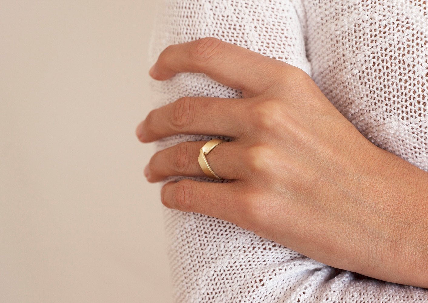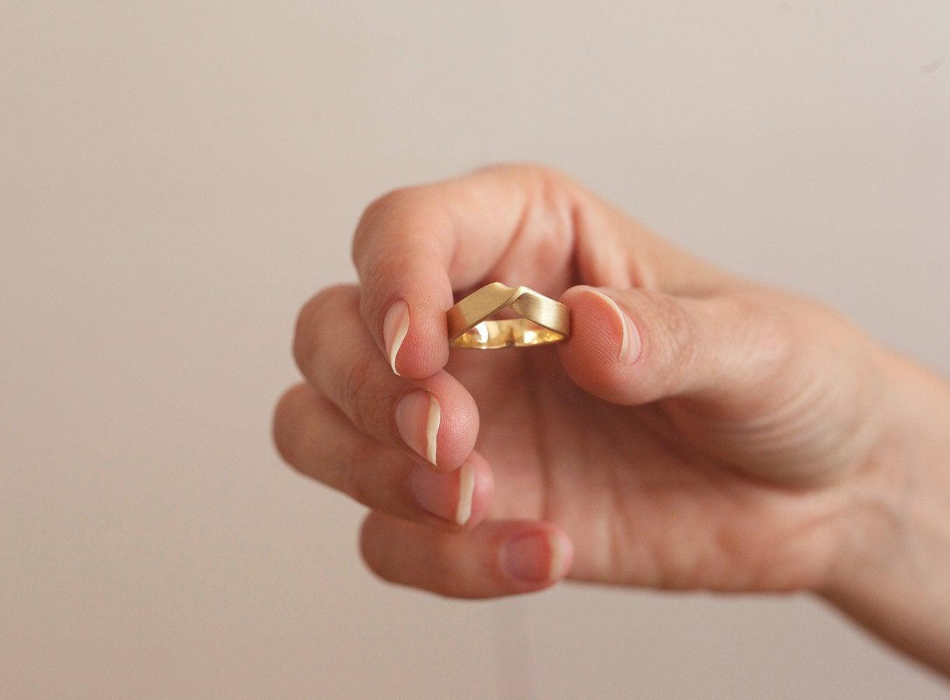 Široka zlatna burma u obliku slova V sa uvijenim prednjim delom, naš Robin prsten je savršen za svakodnevno nošenje. Ovaj uniseks prsten mogu nositi i mladoženja i mlada kao burmu.