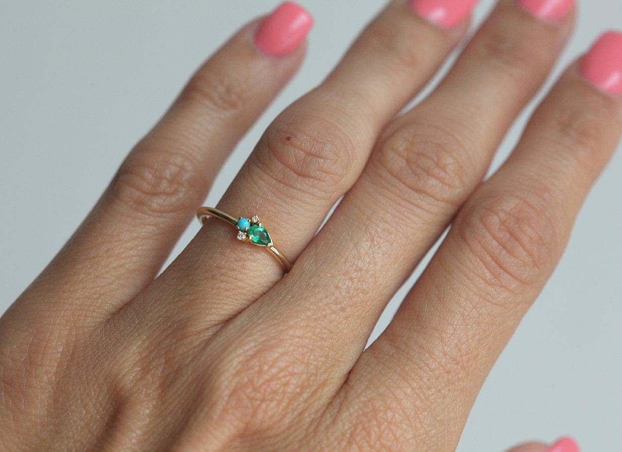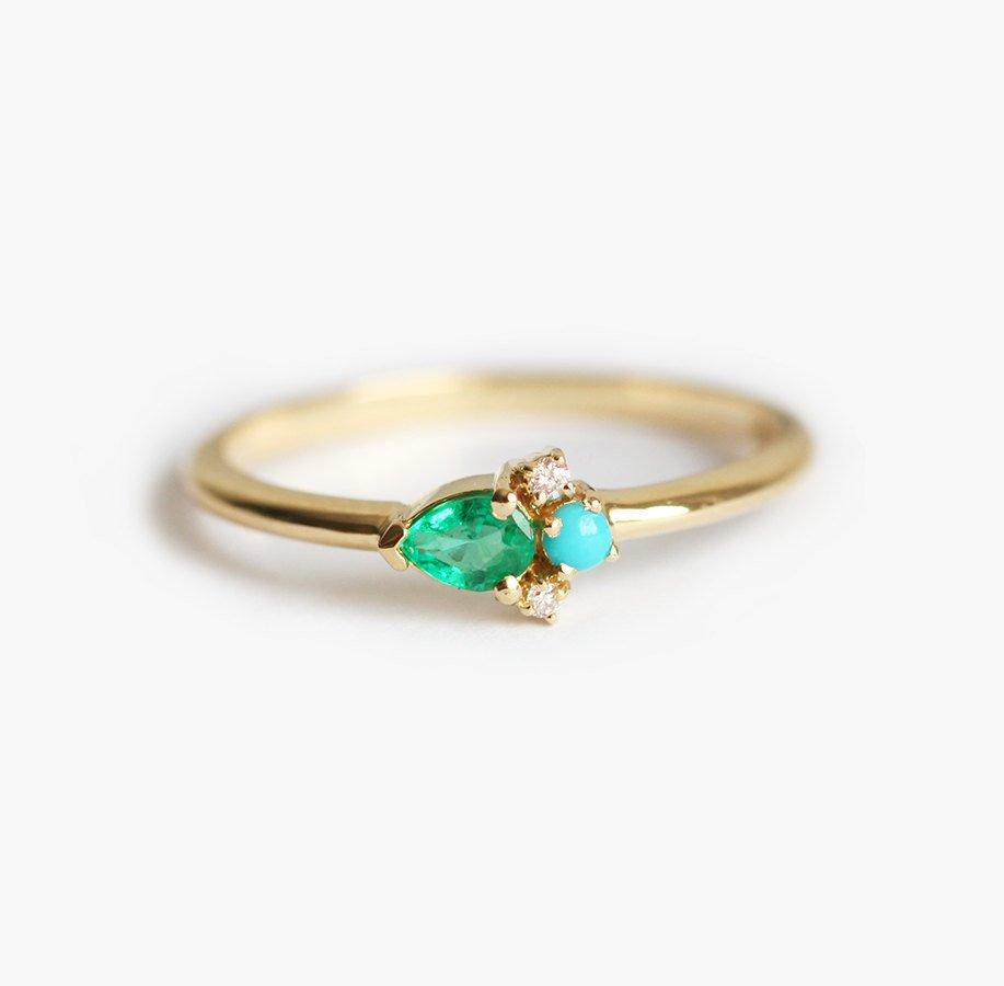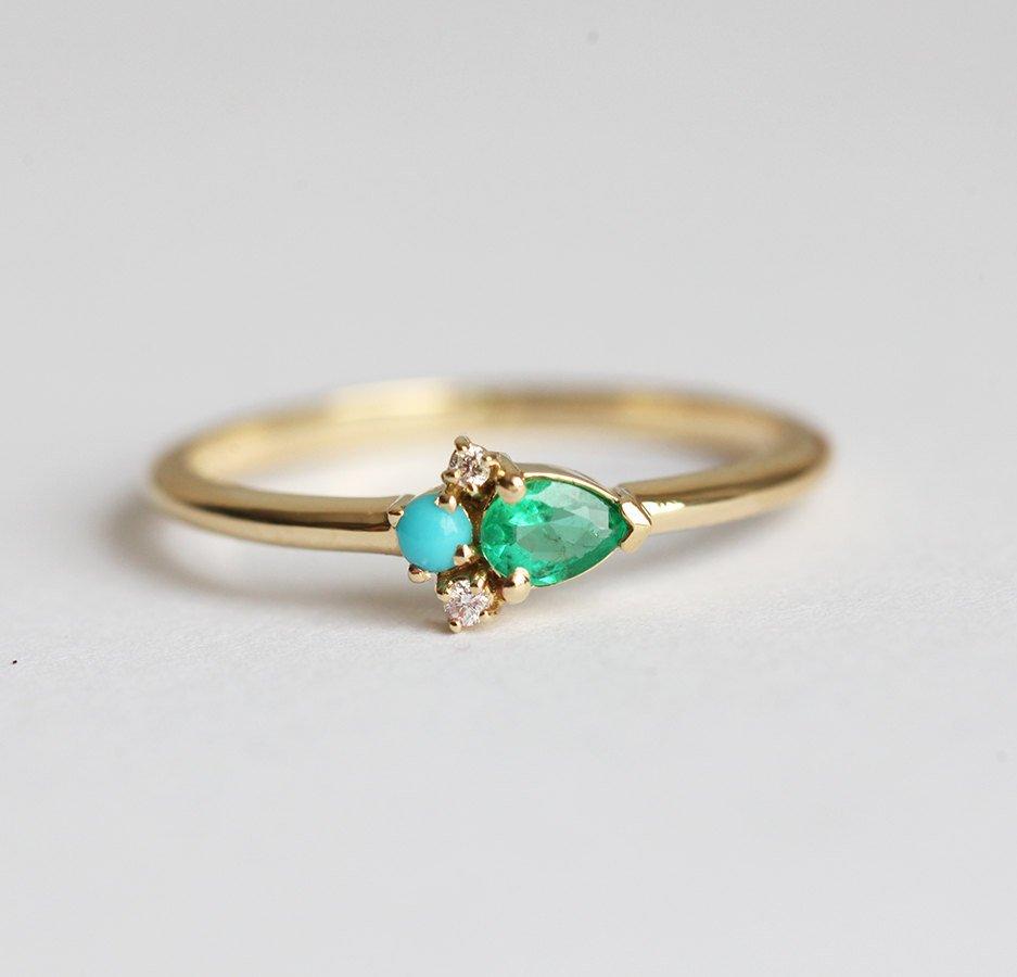 Prelep mali klaster prsten sa pear cut smaragdom, dijamantima i tirkizom čini ga savršenim poklonom za rođendan - takođe može biti izrađen sa kamenom rođenja ili bilo kojim drugim dragim kamenjem po vašem izboru.