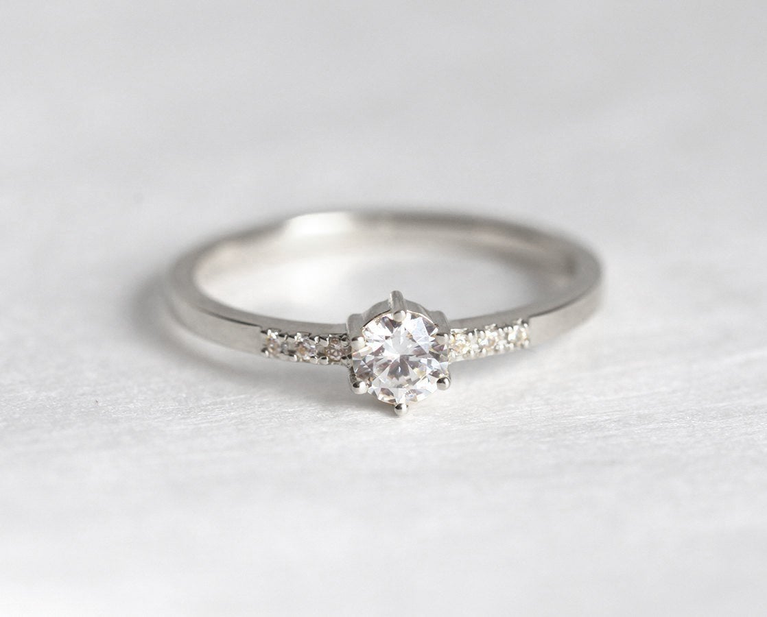 Ženstven i elegantan half pave dijamantski prsten. Klasični okrugli dijamant odiše vanvremenskom elegancijom. Okrugli oblik pruža maksimalan sjaj i izgleda prelepo na svakoj ruci.