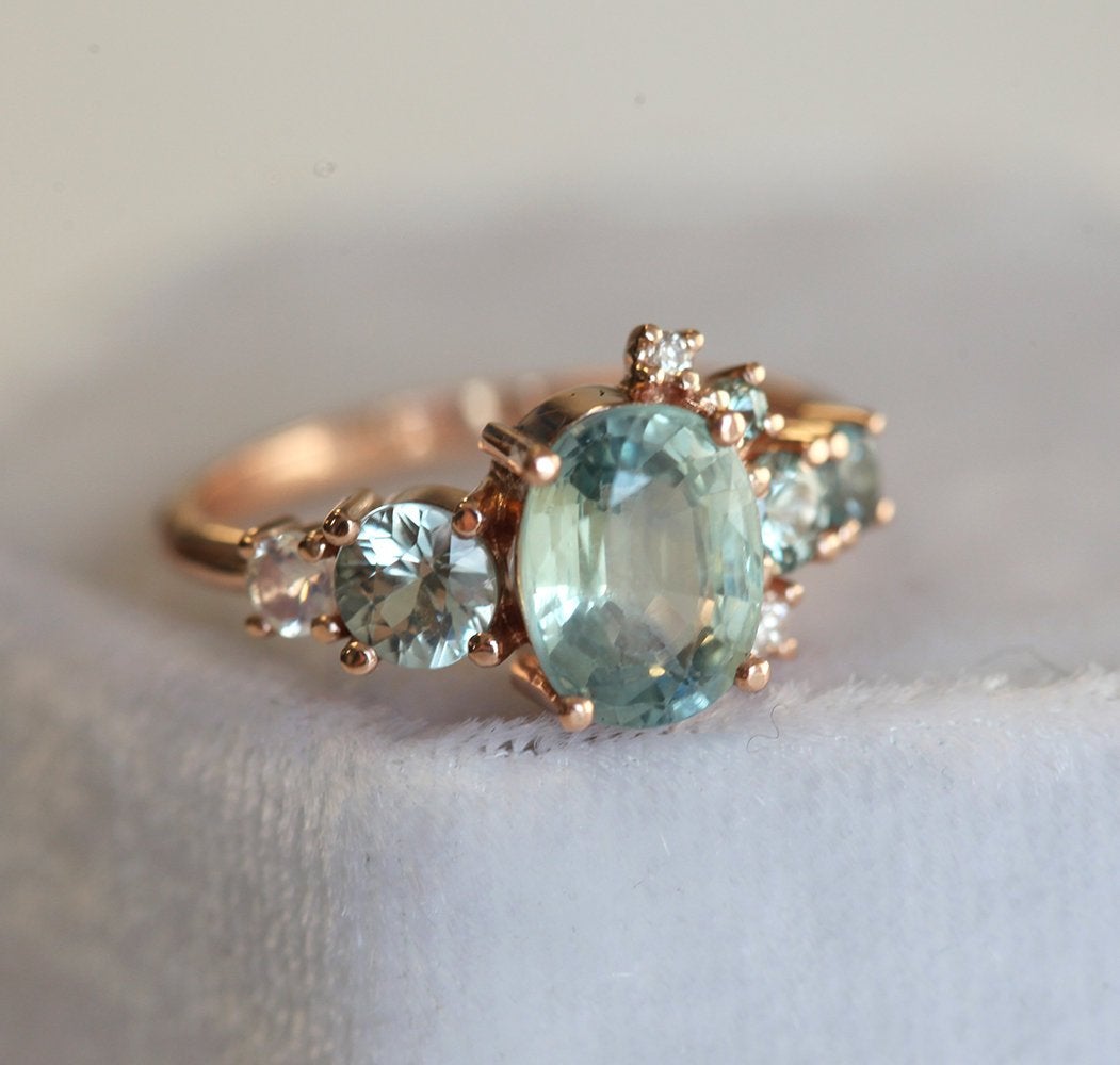 Svetlo zeleni safir klaster verenički prsten. Ako želite da naručite odgovarajući prsten, molimo vas da nas kontaktirate pre kupovine.