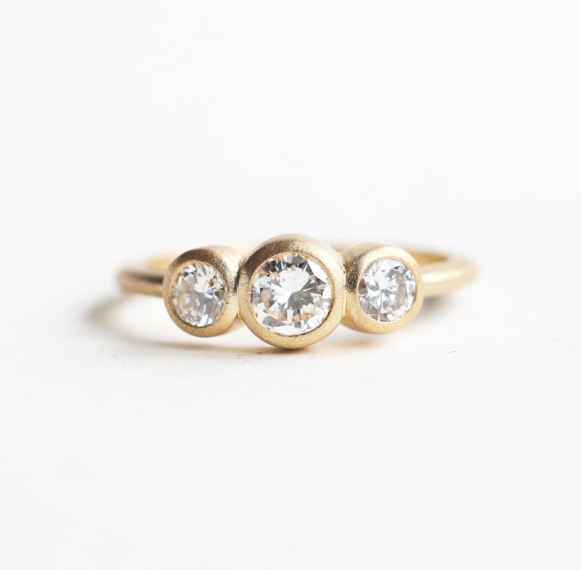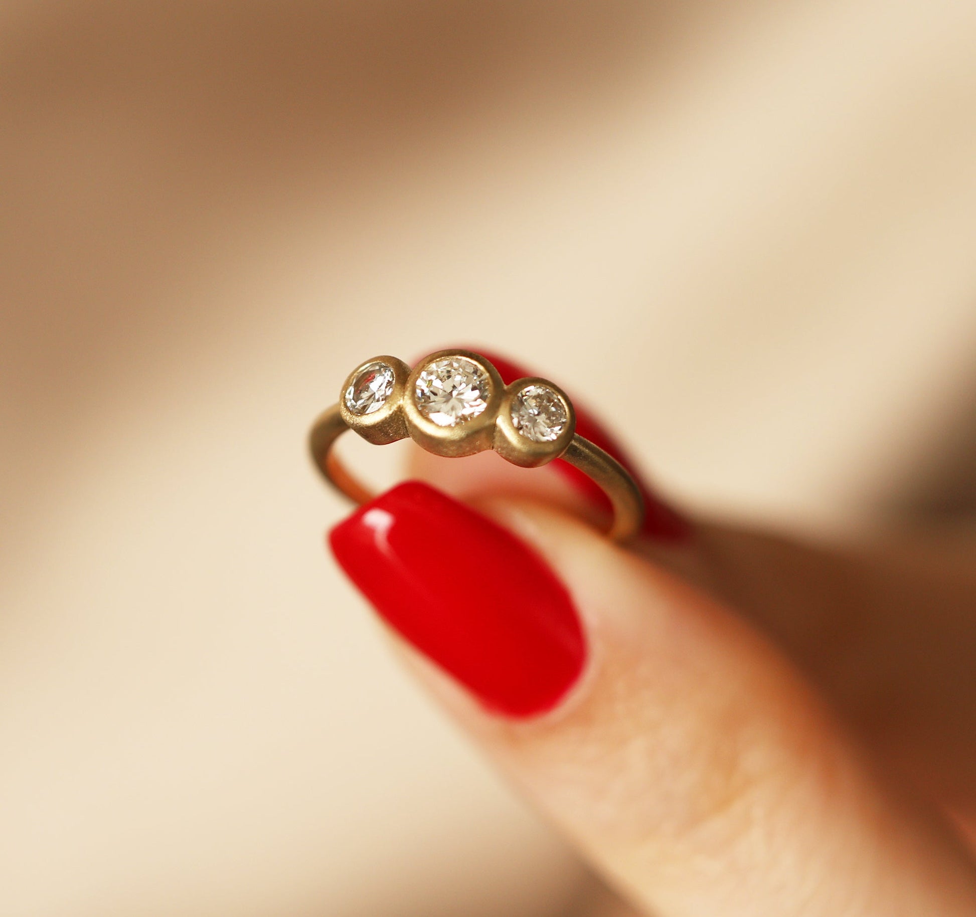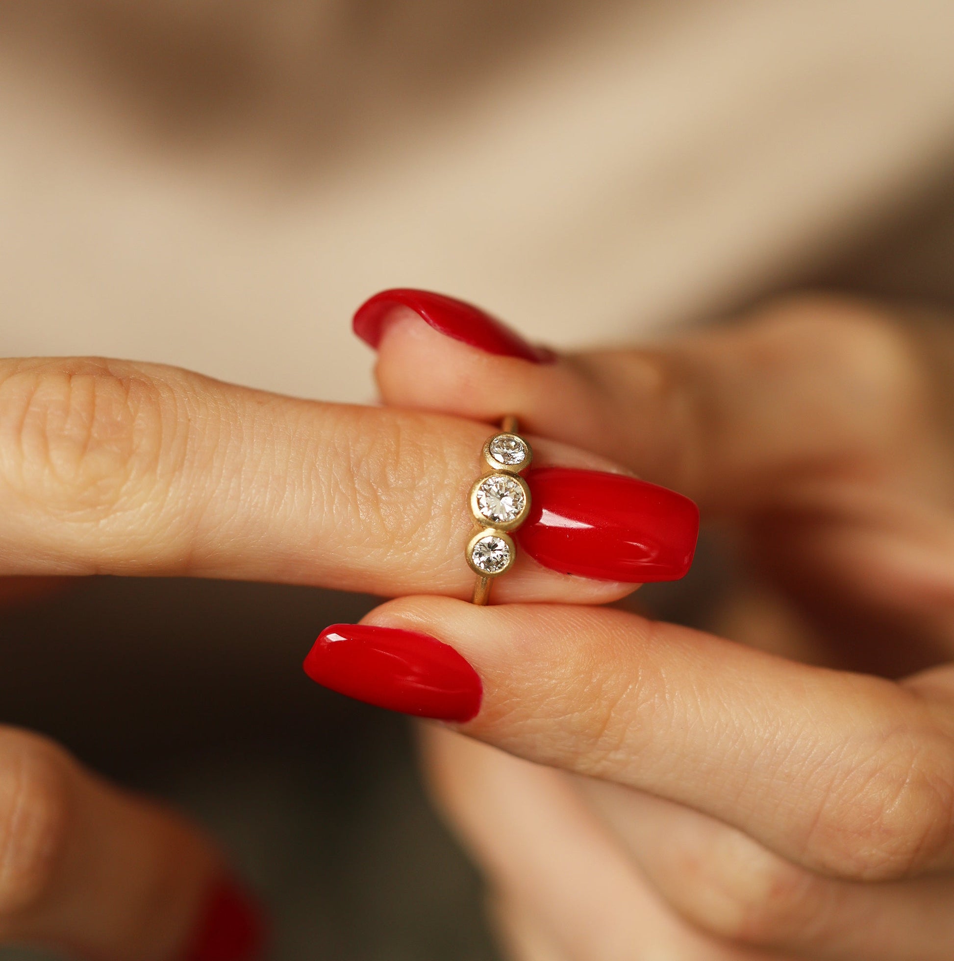 Jednostavan i moderan prsten sa tri dijamanta postavljenim u okvir.