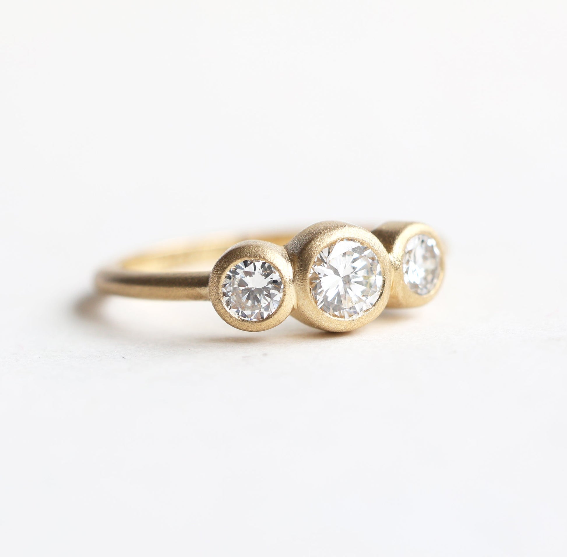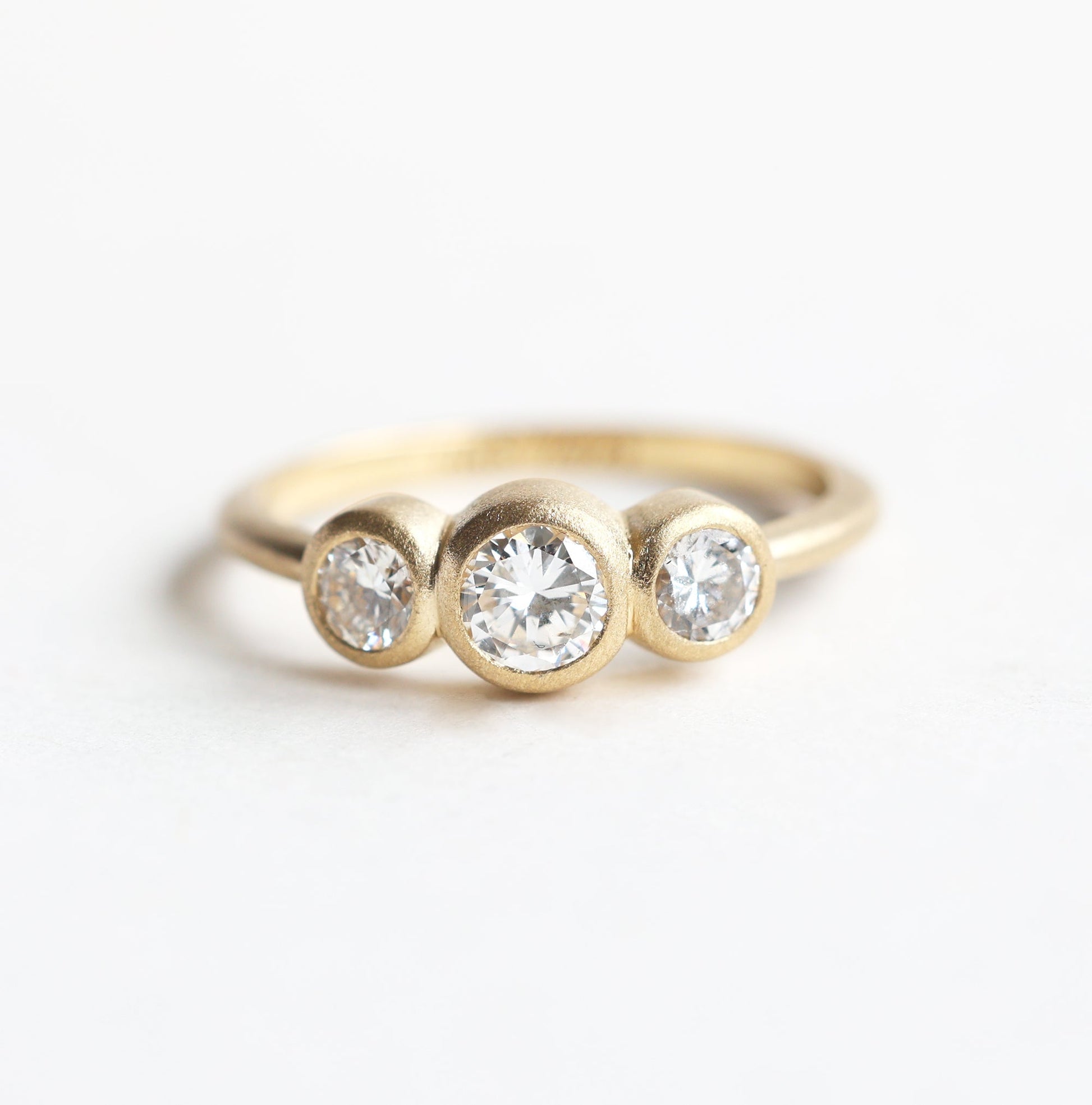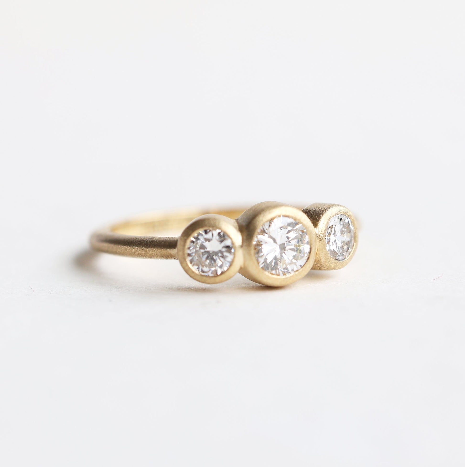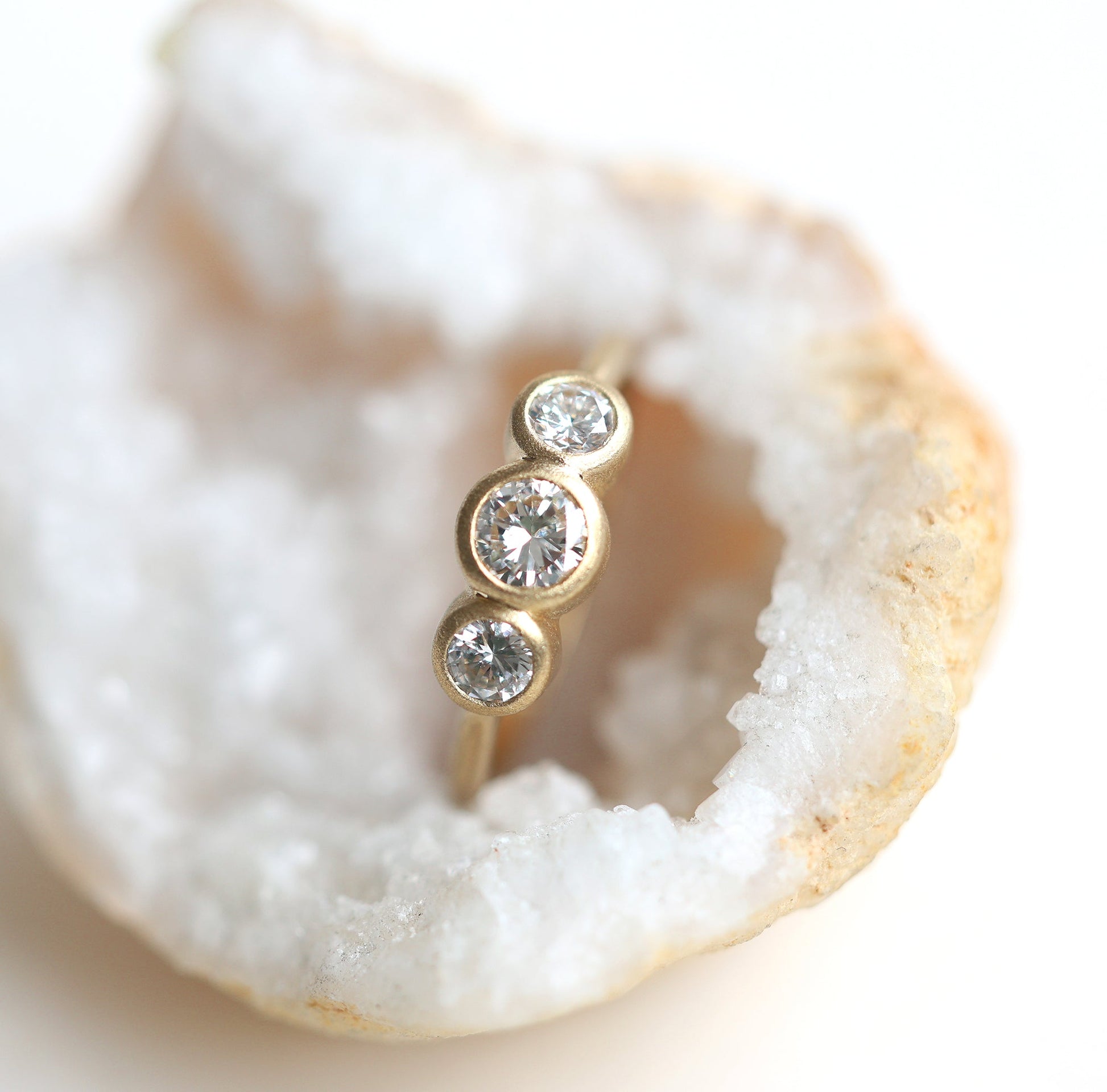 Jednostavan i moderan prsten sa tri dijamanta postavljenim u okvir.