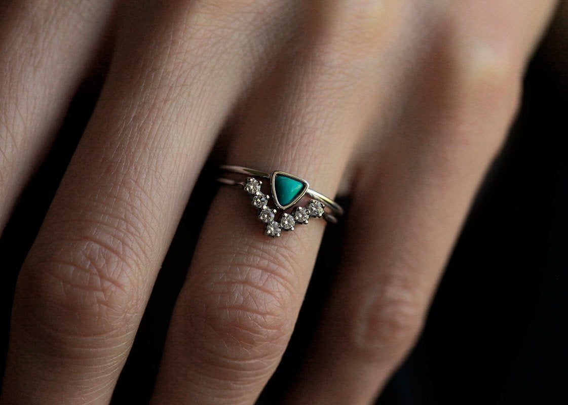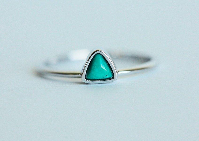 Minimalistički i nežan turkizni prsten u trillion obliku - savršen izbor za boho verenički prsten ili kao uklapajući prsten.