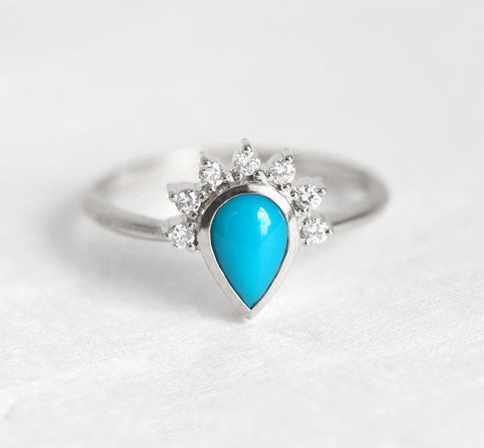 Romantičan boho verenički prsten sa pear cut tirkizom i dijamantskom polukrunom, savršen način da izrazite ljubav.