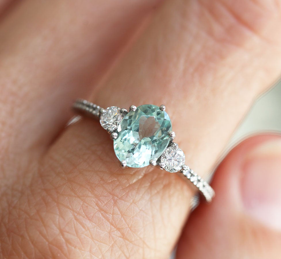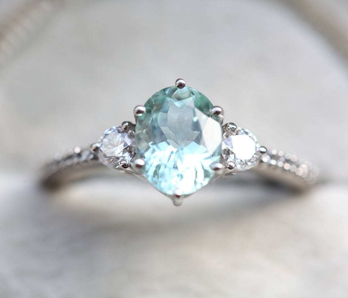 Naš prelepi Sonya prsten prikazuje Paraiba mint nijansu prirodnog turmalina u kombinaciji sa moonstone bočnim kamenjem. Dodajte dašak boje vašoj ljubavnoj priči sa ovim jedinstvenim komadom nakita.