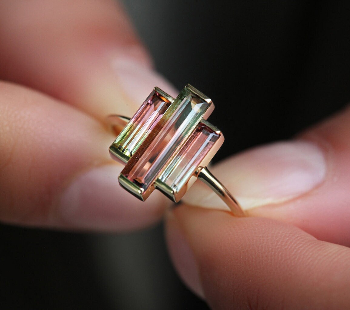 UNIKATNI VERENIČKI PRSTEN SA BAGUETTE CUT TURMALINOM U BOJI LUBENICE