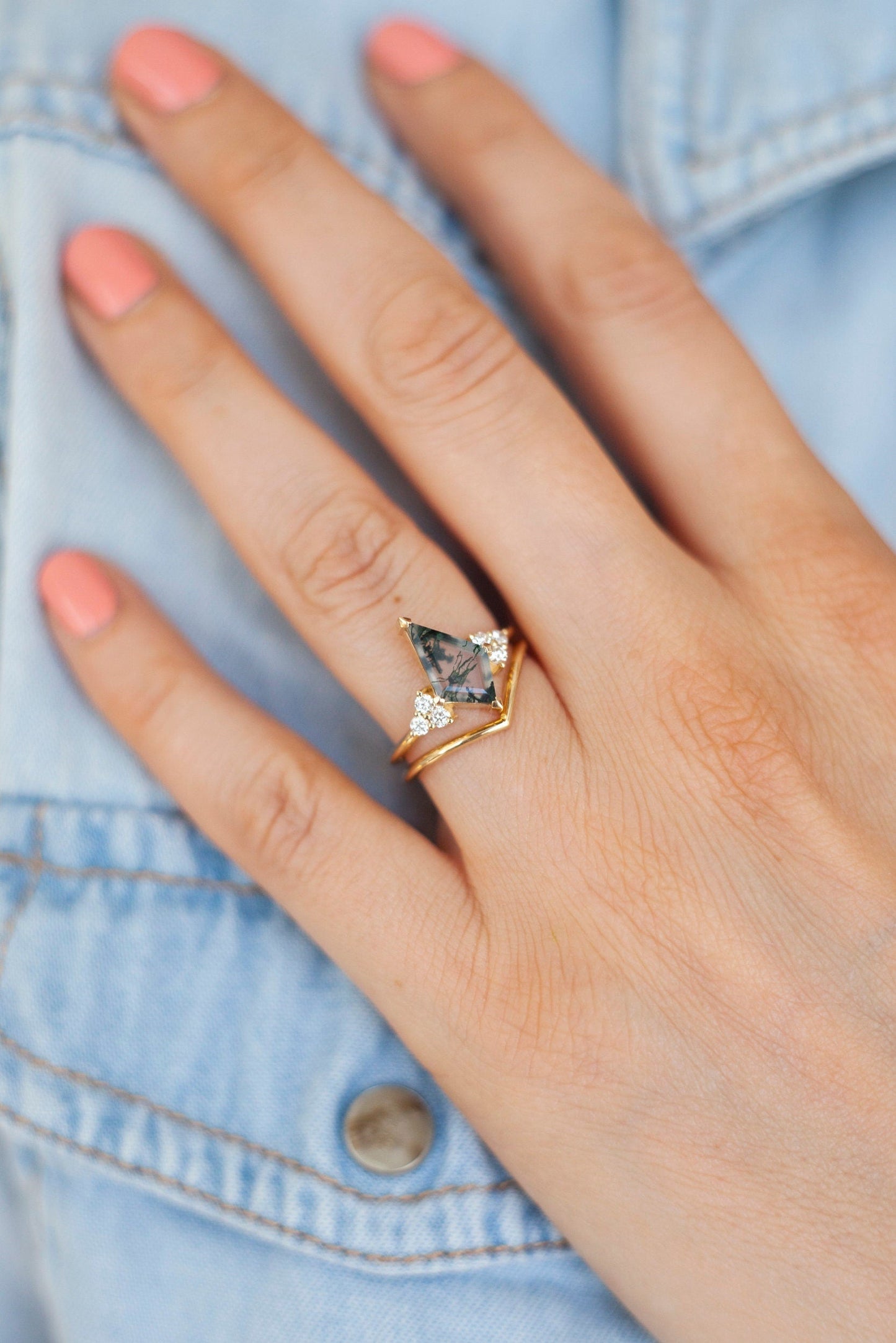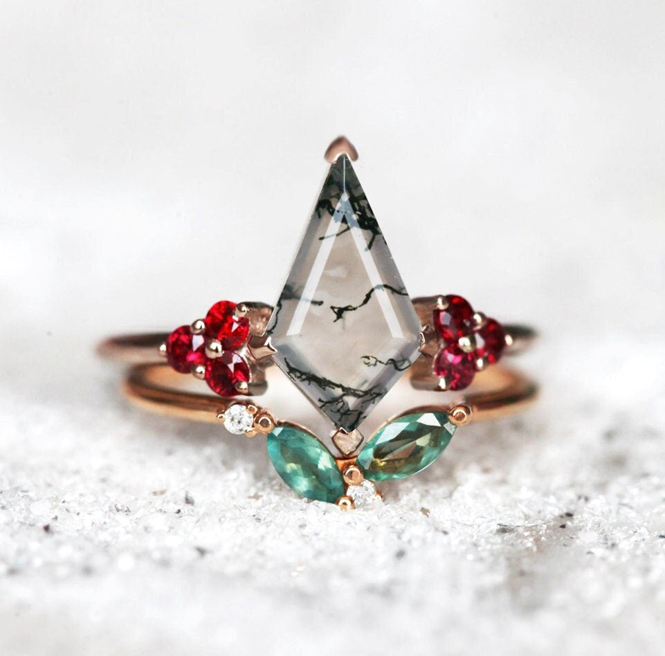 Nevorovatan set od Moss Agate, crvenih safira i aleksandrita ostavlja bez daha. Retka lepota Moss Agate kamena u kombinaciji sa kontrastnim bočnim draguljima čini ovaj komad jednako nezaboravnim kao i vaš poseban dan.
