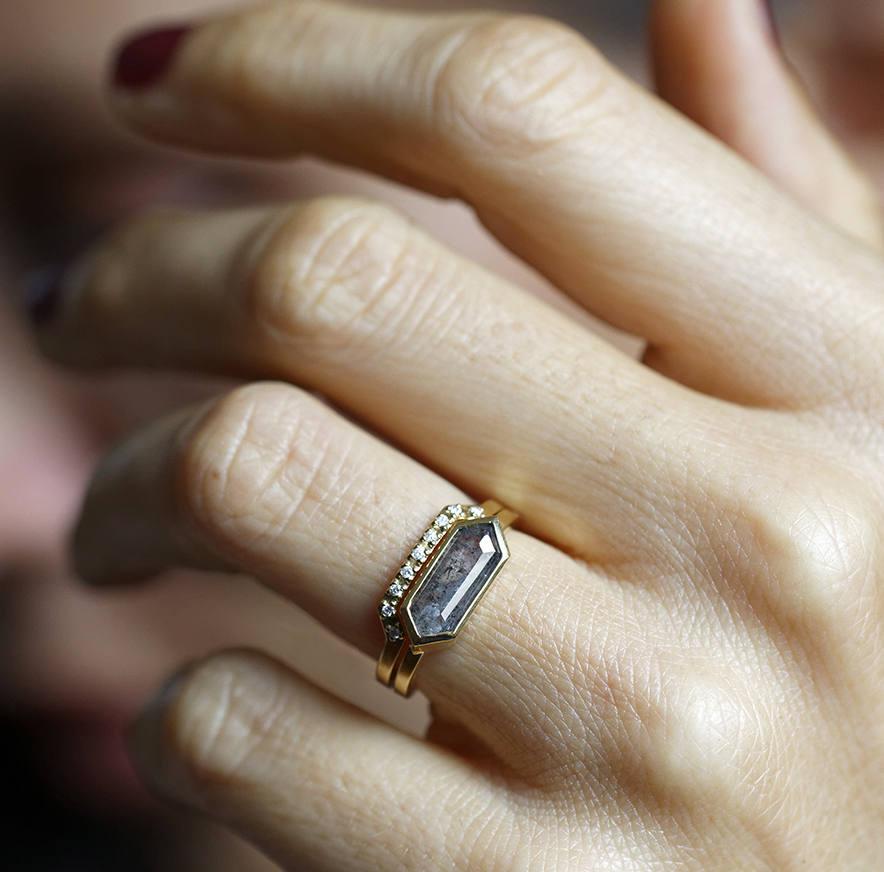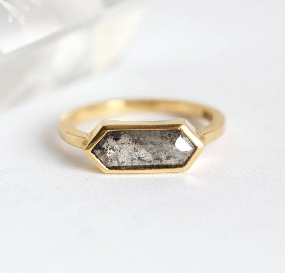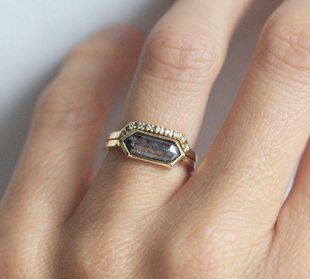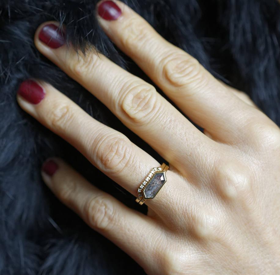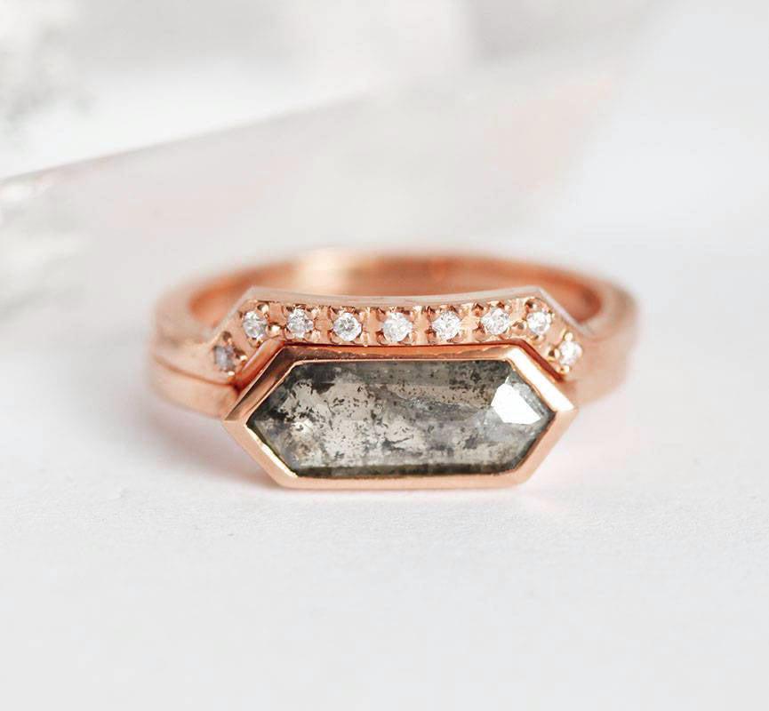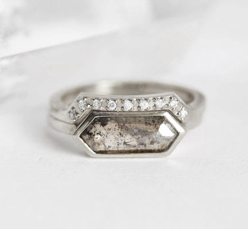 Ljubitelji modernog dizajna će ceniti čiste linije našeg Genevive seta prstenja sa dijamantom sa rose cut brušenjem u obliku heksagona, ali ne bilo kojim dijamantom - posebna vrsta koja je trenutno veoma popularna su "salt & pepper" dijamanti sa prefinjenim sivim nijansama i prirodnim inkluzijama.